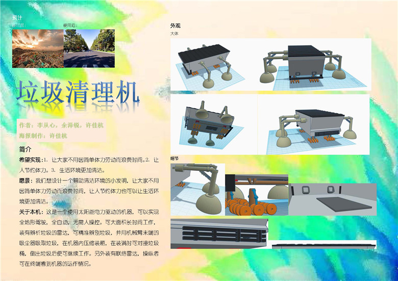 我们的创作原型来源于常见的吸尘器。吸尘器通常用于清理家中的灰尘,而我们的清理对象是大型的垃圾,所以我们可以使用大型的“吸尘器”。我们又从清洁车中找到了灵感。清洁车体型较大,可以存放许多的垃圾,也方便移动,所以我们把吸尘器和清洁车结合在一起,制作成了我们的垃圾清理机。