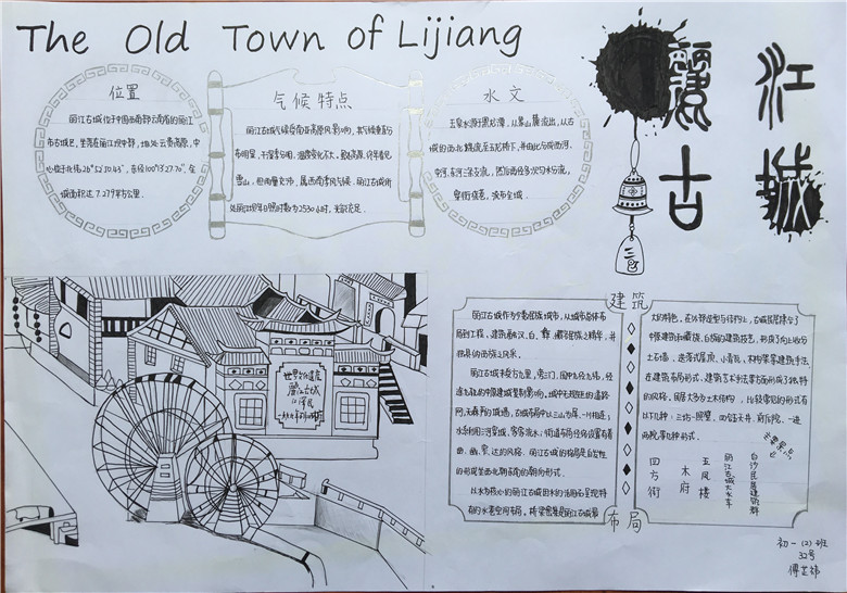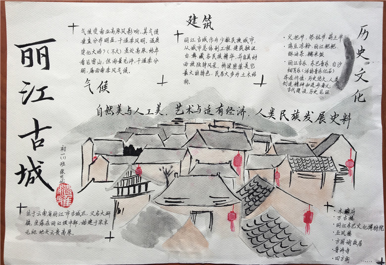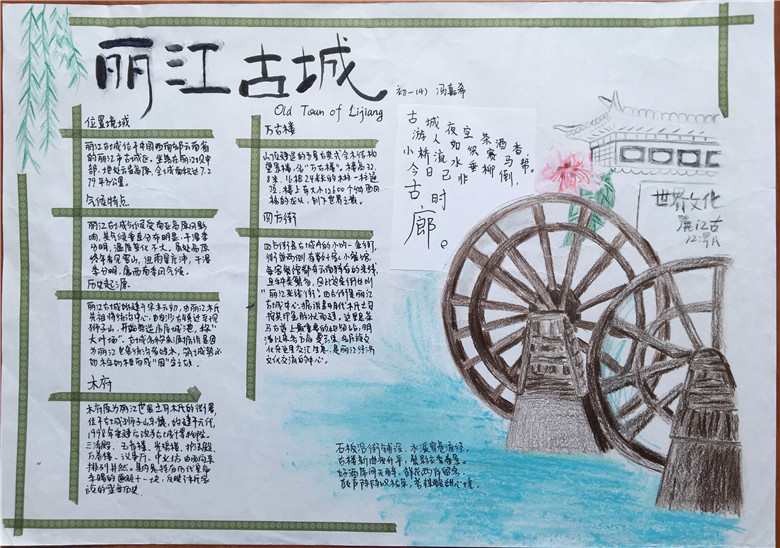 我设计了一副有关丽江古城的小报。在小学的时候,我曾去过丽江,这儿有美味的桂林米粉,高耸的玉龙雪山以至于当老师一说这个作业我就想到丽江古城。丽江古城有这丰富的历史底蕴,有许多值得让我去介绍的事物。