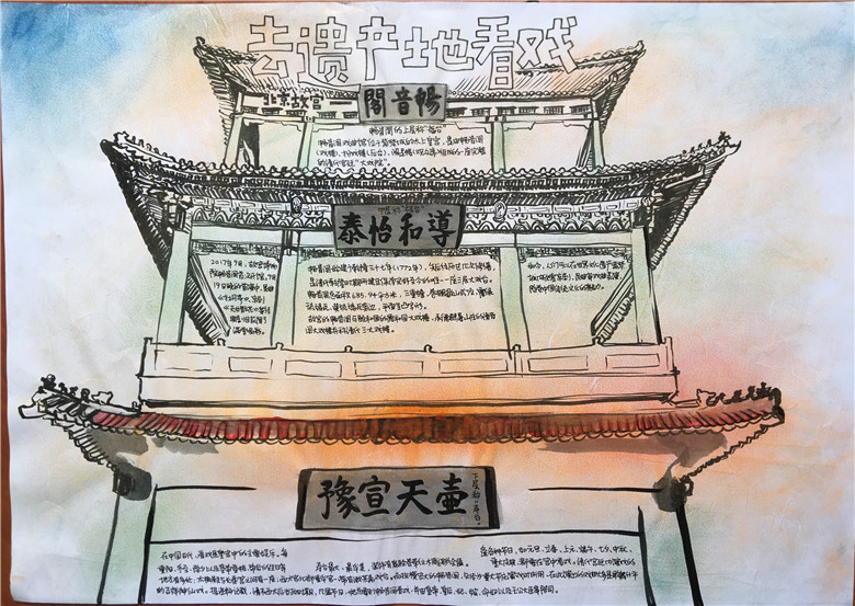 先说说我小报的主题吧——去遗产地看戏。这次寒假我选择了畅音阁。这是故宫里的一个戏台,2017年再次开馆。如今,人们可以在世界文化遗产紫禁城内欣赏京剧、昆曲等戏曲表演,感受中国传统文化的魅力。
