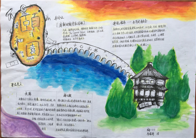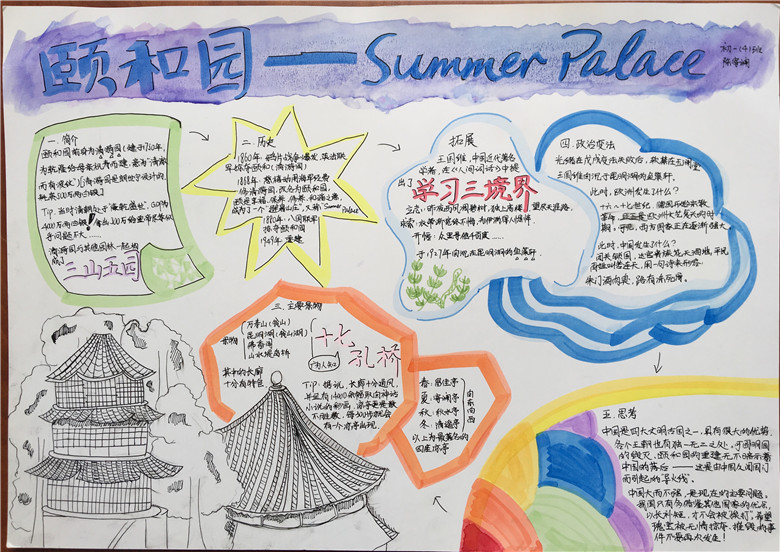 于是我将我的小报分为了三部分:圆明园简介,关于圆明园的一些有趣的传说和插图。简介是根据百度词条整理后的文段,我还选取了一部分有趣的传说:我们都知道颐和园的前身是清漪园,是乾隆为母亲孝圣宪皇太后过大寿而建。所以,为了取个好兆头,乾隆下令把昆明湖划分成“里湖”和“外湖”,里湖形似寿桃,而外湖则是寿桃的叶子。而插图,我使用了水彩上色,更好地绘制出了颐和园的美景。