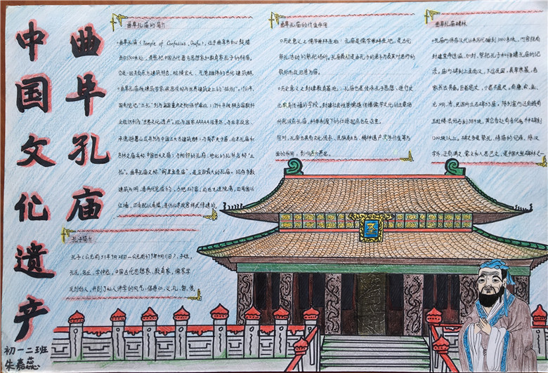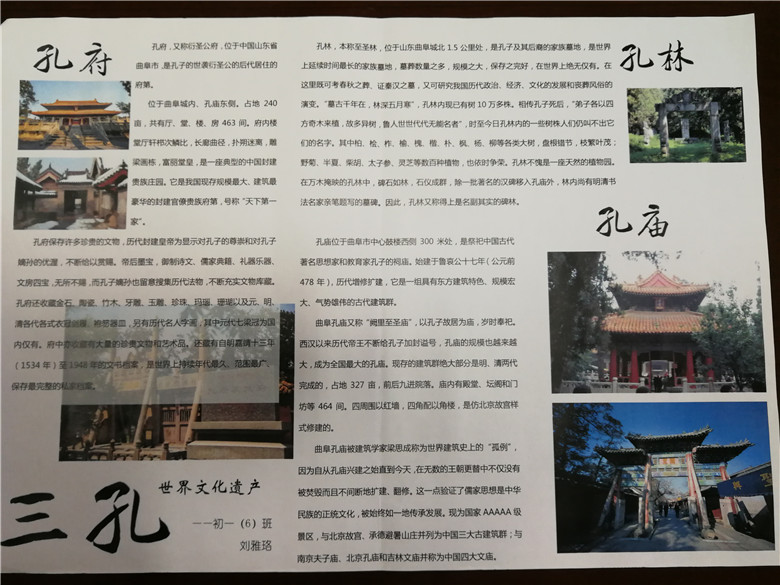 我的小报主题是“三孔”:孔府、孔庙、孔林。这一著名的世界遗产的坐标位置与灵魂位置就位于我的老家山东。At first, 我只是在电脑上查阅资料。一排排的网页出现在浏览器中,也在我的脑海里出现又消失。我几乎要把出现在不同website的同一段话背下来了,但至圣林的琼楼玉宇的蓝图仍未在我的记忆中建模出来。