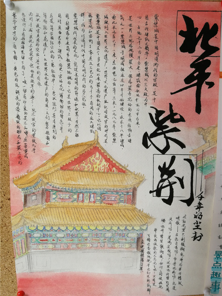 第一重要的是排版,我看到很多展板上同学的小报都是画和文字分开的,不过这种方式仅限于画画奆佬。我的话比较喜欢以画作底,文字覆盖,标题正中间的形式,因为这样主题比较鲜明,大面积的上色既可以使小报更有韵味,也可以掩盖一些技术上的不足,对画作的要求也没有那么高,当然,这属于可远观而不可细赏的类型。