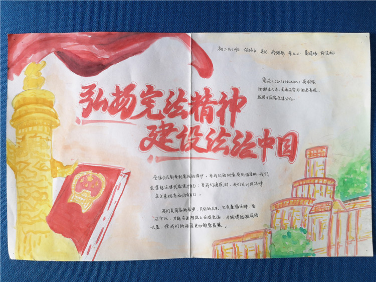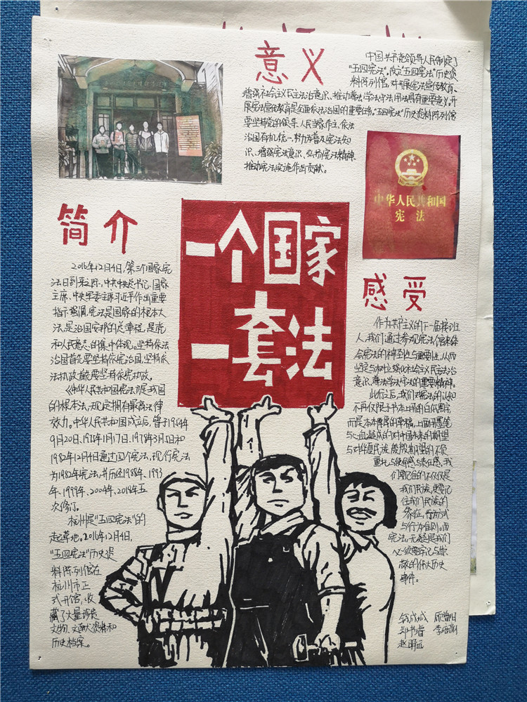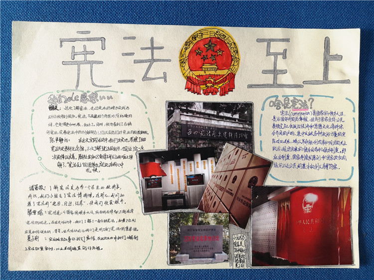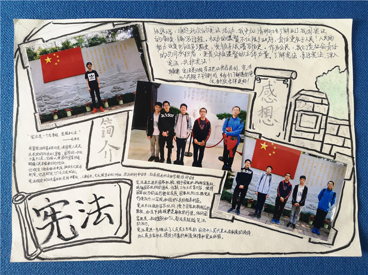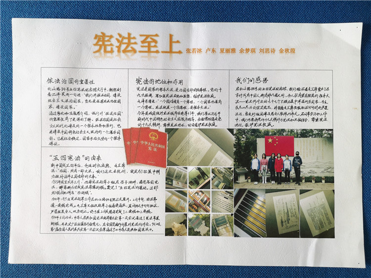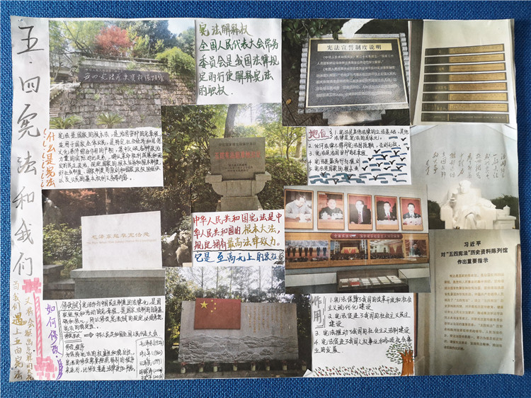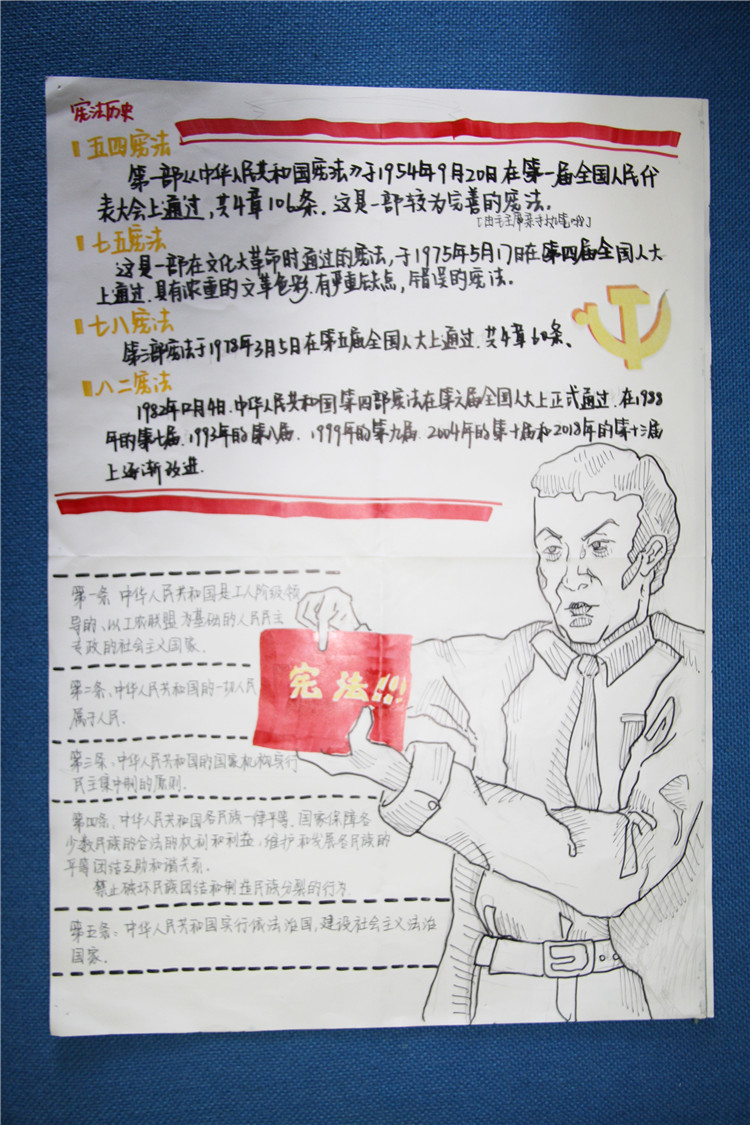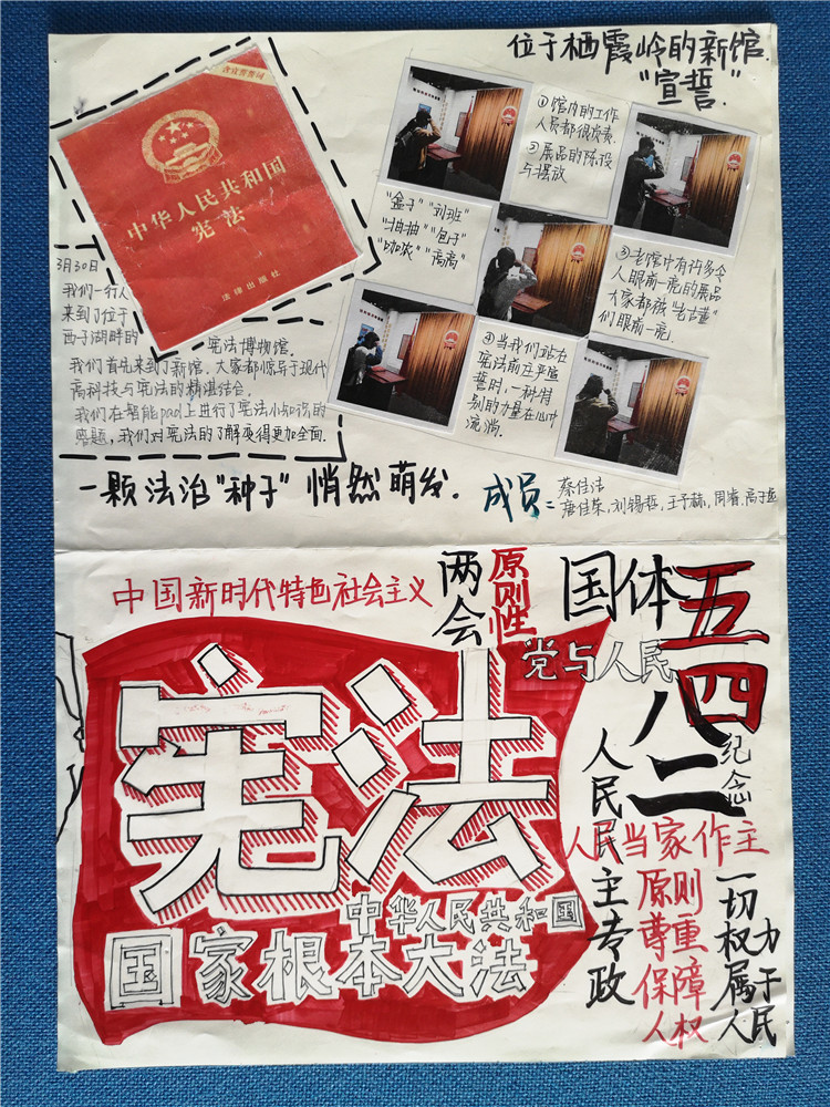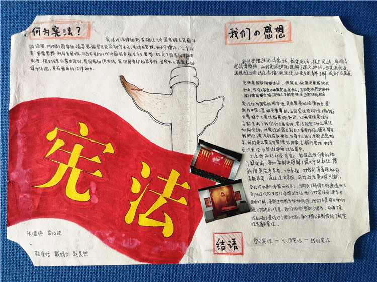 这次活动,我们被宪法深深地震撼了。我国现行宪法足足有百余章,几乎涵盖了所有大大小小的问题。这是毛主席以及其他同志在当时还是用书信方式交流时一章章规划出来的,这是多么艰辛,伟大的过程。宪法的推行,是为了老百姓更安定的生活,因此,我们应该不忘初心,为祖国而学习,而奋斗!