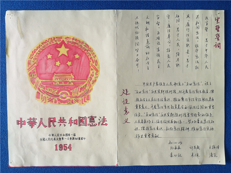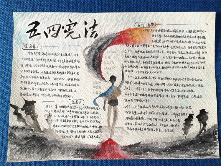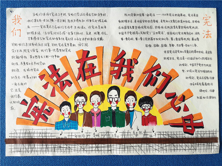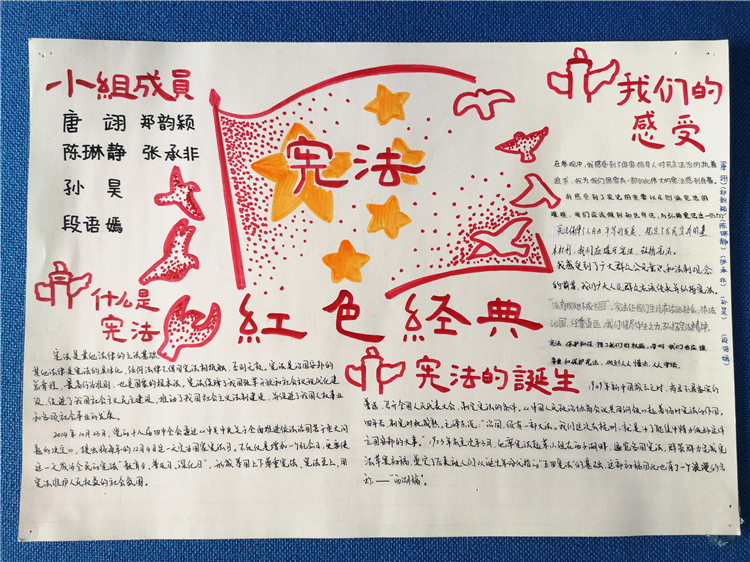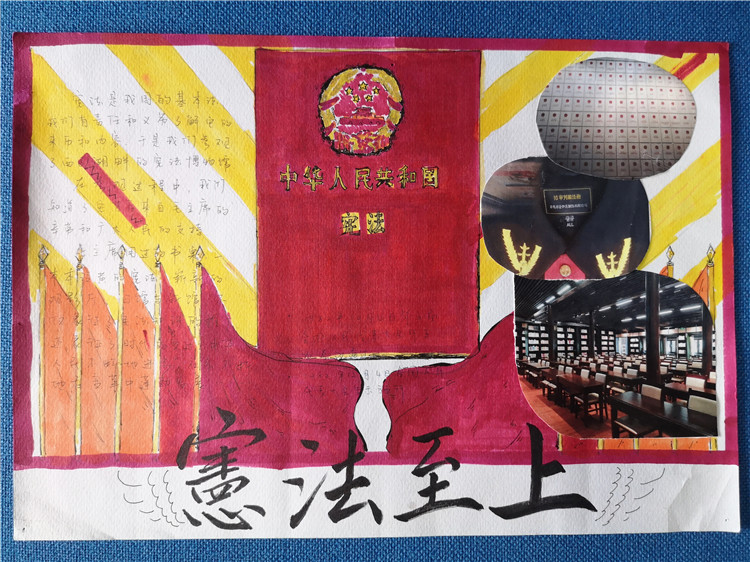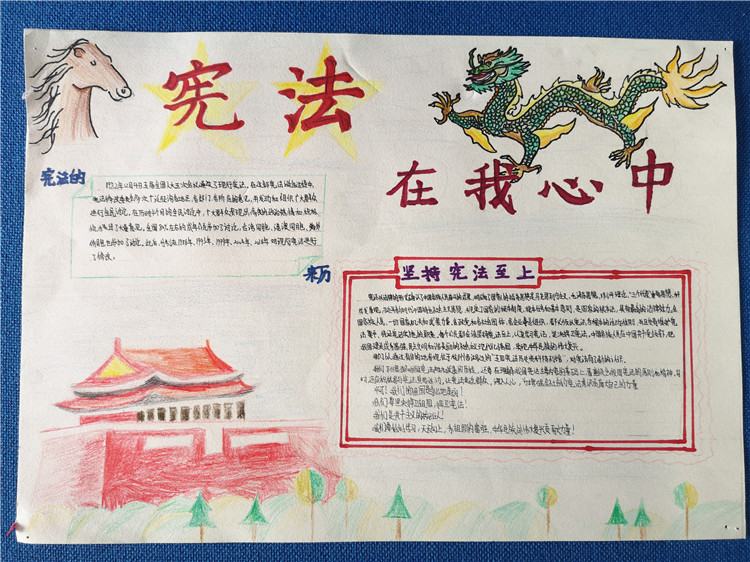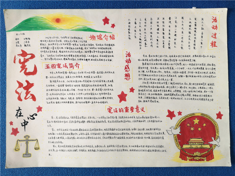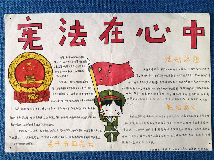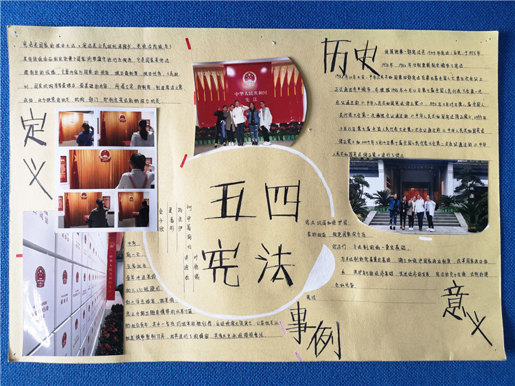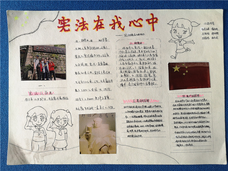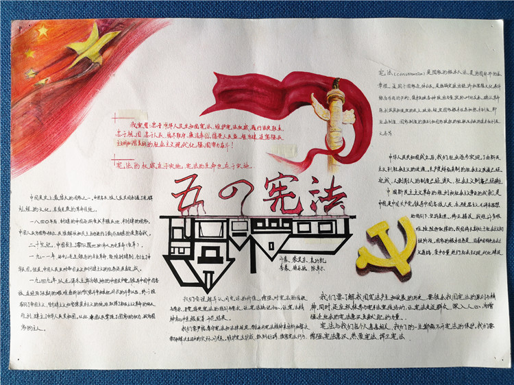 这次活动,我们被宪法深深地震撼了。我国现行宪法足足有百余章,几乎涵盖了所有大大小小的问题。这是毛主席以及其他同志在当时还是用书信方式交流时一章章规划出来的,这是多么艰辛,伟大的过程。宪法的推行,是为了老百姓更安定的生活,因此,我们应该不忘初心,为祖国而学习,而奋斗!