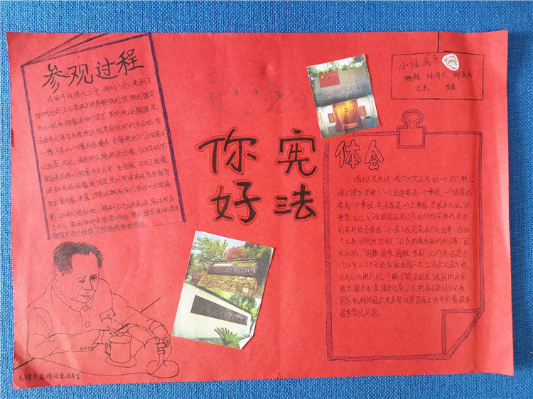参观中,印象最深的是以国旗映衬,用来宣誓的一个展台。“我宣誓:忠于中华人民共和国宪法”。每个人握起拳头,短短几句话,庄严肃穆。课后我们也通过完成小报来记录这美好瞬间。参观可能是平时生活中十分常见的事,但并不是每次参观都有如此这般的感受。激动,自豪,尊敬,甚至无法用语言来表述。