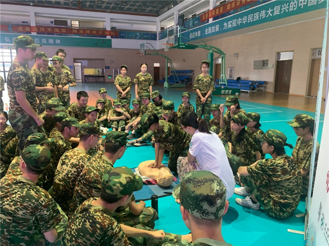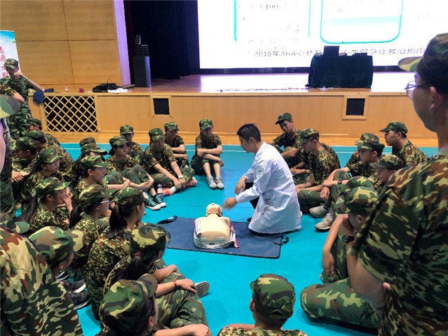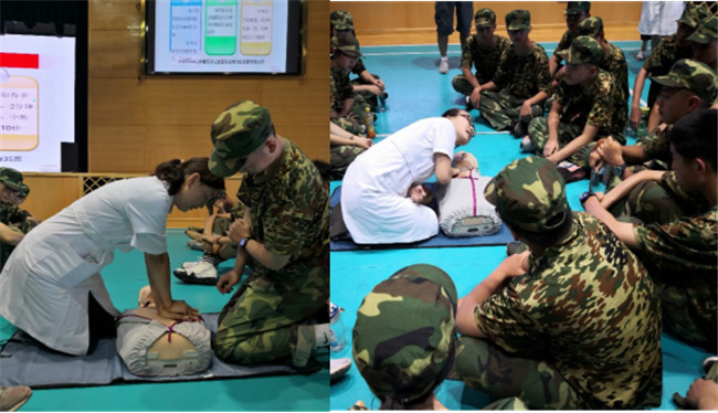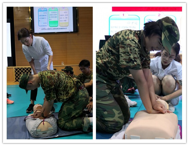 当然,除了站军姿,除了立正、稍息、齐步走,今天还有一个非常重要的活动,就是下午的心肺复苏讲座和实践。医生们向我们详细讲述了心肺复苏术的重要性和具体的操作步骤,本以为古板的课程结果被老师讲得生动有趣,体育馆内充满了欢声笑语。