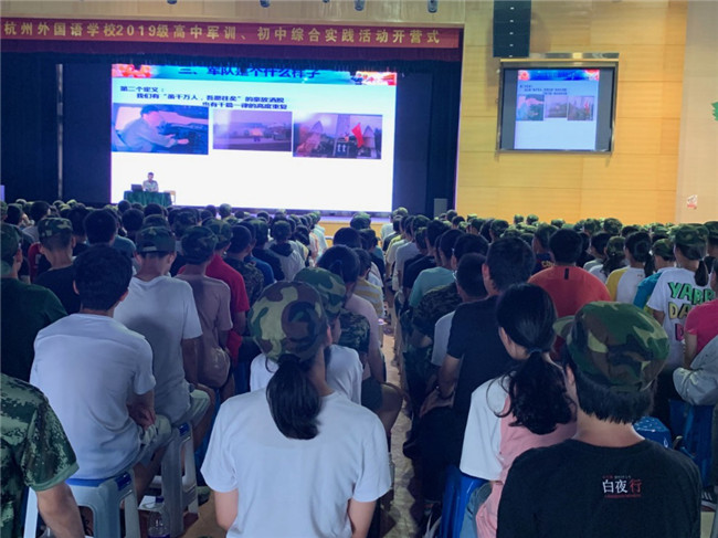 第三天,在经历了大半个上午的日晒煎熬后,大家拖着疲惫的身躯走进了体育馆。伴随着学生处主任朱伟杰老师简单的介绍,我们认识了这样一位毕业于杭外,而今作为一名光荣军人的刘全学长,他为我们讲述了他的故事。我们的疲惫被一扫而空,每一位同学的眼睛都闪烁着或多或少的光芒,心目中充满了对军人的憧憬和向往。