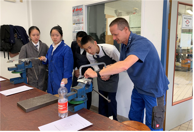 我校学生在志愿者带领下参观了校园以及各个工作坊,体验了金属钥匙扣制作,帆布袋印刷,同住家学生进入课堂学习。同时,为即将到我校交流的德国学生简要介绍了我校及杭州概况。