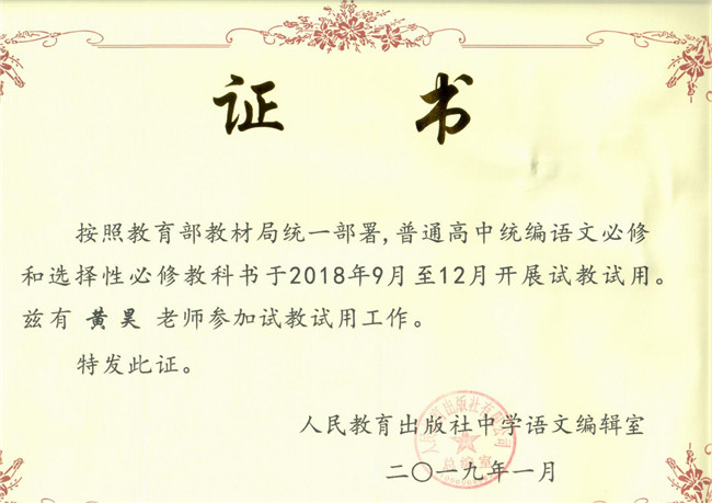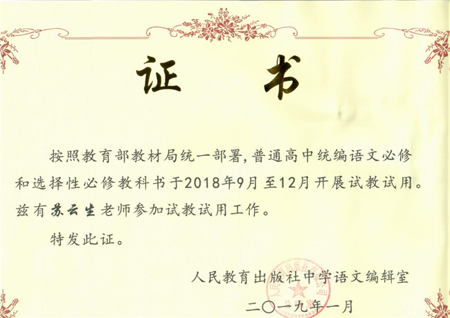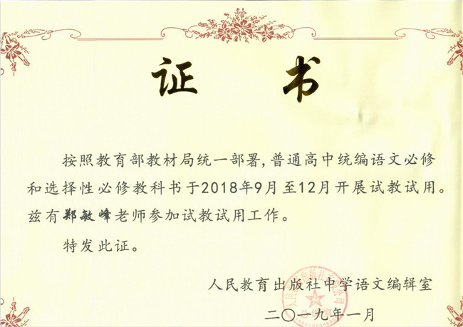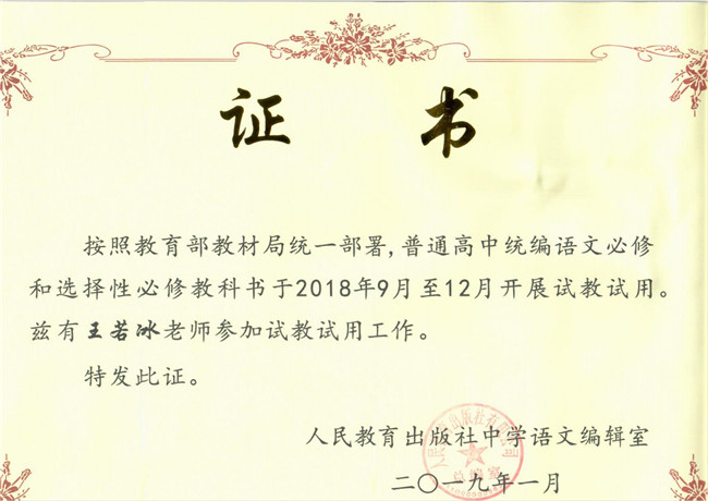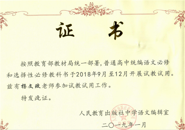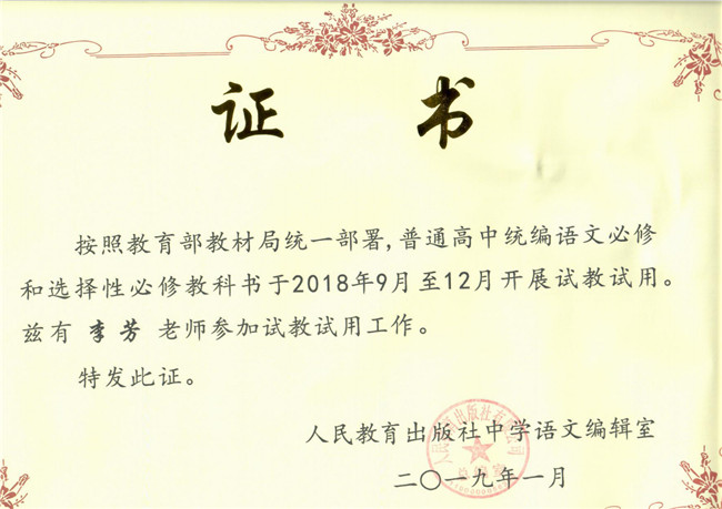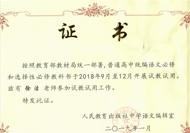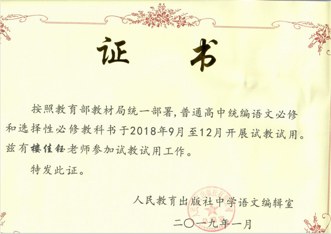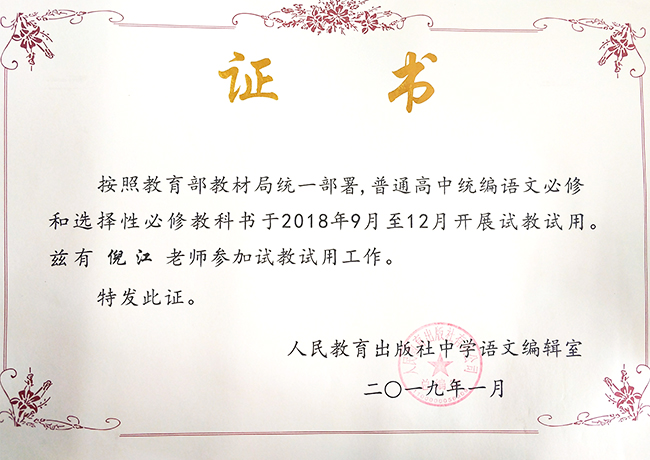 普通高中语文统编教材编写工作于2017年9月启动,到2018年底形成普通高中语文必修和选择性必修统编教材初稿,我校高中语文老师有幸于2018学年第一学期在高一年级开展试教试用工作。学校高度重视,教师认真准备。从动员到学习课标理念,从授课到落实作业,从完成调查问卷到提交试教报告,高中语文老师们小组合作、分工合理、群策群力、共同研讨,及时收集学生反馈信息并总结经验,也坦诚地提出了有针对性的修改和使用建议。试教试用工作圆满完成,老师们也收获了人民教育出版社中学语文编辑室颁发的证书。