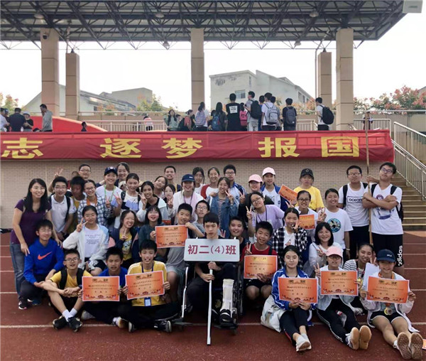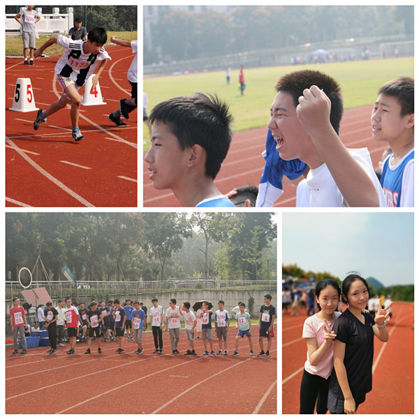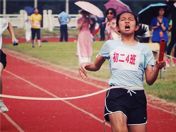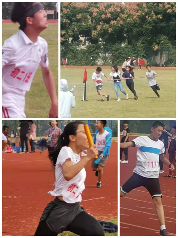 初二(4)班的同学们在赛道上使劲奔跑,在栏杆前飞身腾跃,将实心球掷出弧线……我们不惜流汗,我们奋力呐喊,我们拼命鼓劲……我们为青春而战,我们为彼此加油,我们为四班拼搏!