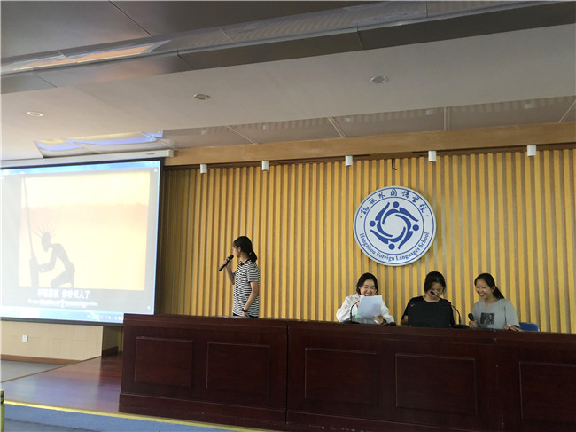 最有趣的当属《小猪佩奇》了——来自德、法、西三个语种的同学们非常“巧合”地选择了“peppa pig”这部风靡全球的动画片。一时间,整个报告厅笑声交融,台下的同学们也纷纷被有趣的剧情所吸引,乐滋滋地欣赏着来自“全球各地”的粉红猪小妹们。