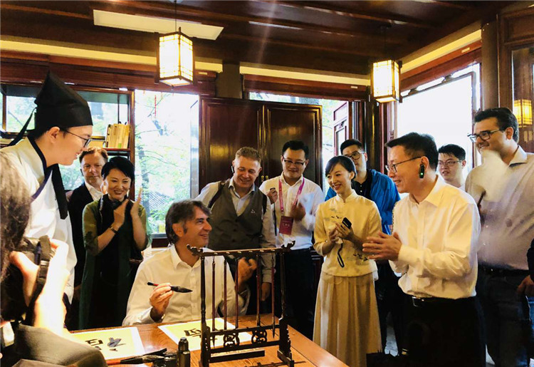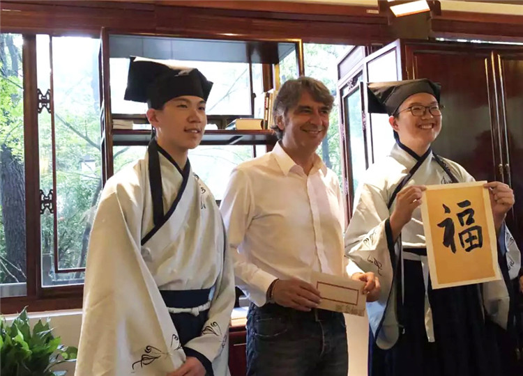 此次活动采用实景体验、沉浸式表演的形式,郁阳、洪锦成分别扮演两个书童,在万松书院的藏书阁展示中国传统书法艺术。在现场,他们向意大利友人介绍、书写了代表着中国文化的毛笔字,并将自己精心准备的书法作品赠送给外国来宾。两位同学的出色表现,赢得了意大利友人的充分肯定,展示了杭外学生的良好形象。