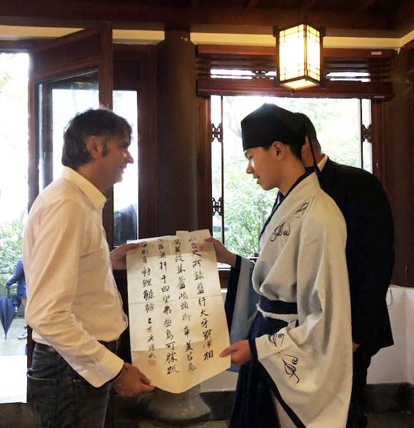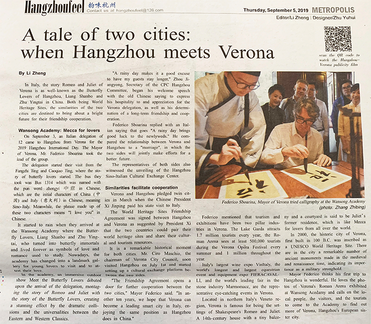 2019年3月,习近平主席访问意大利,进一步推动了中意之间的文化交流。在两国元首的见证下,杭州和维罗纳共同签署了《世界遗产地友好关系协议》,两个拥有古老文明的城市相遇“牵手”。9月3日,杭州与维罗纳城市文化交流活动在万松书院举行,我校高二年级学生郁阳、洪锦成受邀参加。