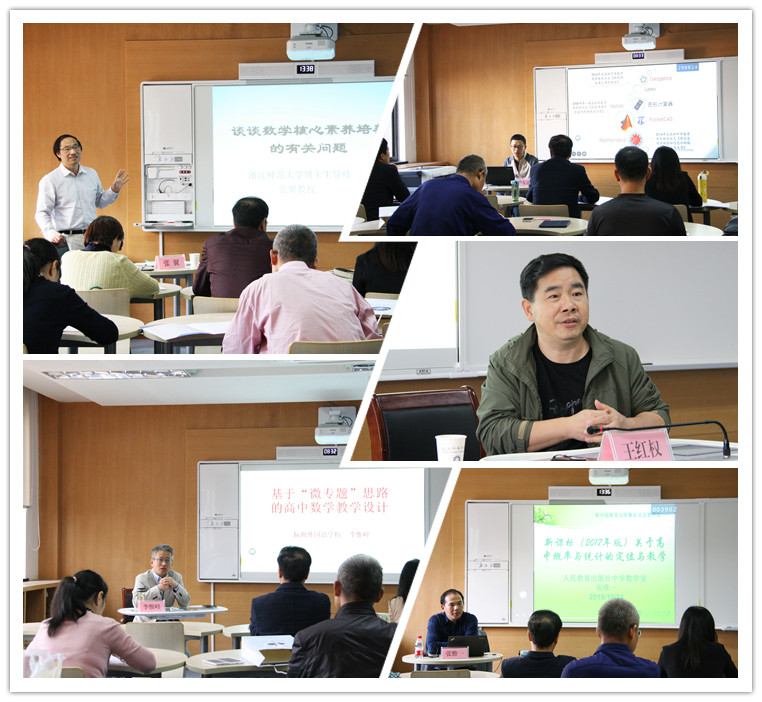 在5天的培训中,共开设5场专题讲座,6节专题研讨课。人民教育出版社中学数学室副主任张唯一老师、浙江师范大学张翼教授、杭州市普通教育研究室王红权特级教师分别作专题讲座。我校教务处主任李惟峰老师开设讲座《基于微专题思路的高中数学教学》、卢东波老师开设讲座《“信”手拈来——信息技术在数学教学中的应用》,倪瑞祥、张传鹏、徐国君、尤宁、刘晓英、朱锦娟等老师分别开出了展示课,课后还与培训老师进行了交流研讨。这些讲座和公开课的课程内容新颖,注重数学思想的渗透和教育技术的运用,富有启发性,获得全体学员好评,均反映了我校数学组教师近年来积极探索和教研的成果,并形成一个完整的育人序列,拓展了数学教学的范畴。