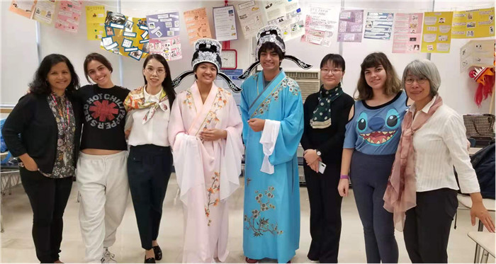 访问期间,两位老师向美国西橘高中学生讲授了中国传统文化、中国民间故事等,使美国学生对中国传统文化有了更进一步的了解。同时,在两位老师的精心指导下,美国西橘高中学生用中文和中国舞蹈成功演绎了中国民间故事《梁山伯与祝英台》,学生们精彩的表演获得了美方教师与学生们的一致好评。两位老师还与西橘高中的老师进行了多方面的深入交流,了解了他们的办学情况及课程特色,并观摩了两所学校的音乐课、英语课、烹饪课和陶艺课等课程,收获颇丰。此外,西橘高中学生对中文学习热情高涨,他们对回复杭外学生的来信兴致颇高,并认真地用中文写了回信,以此增进两校学生之间的沟通与交流。