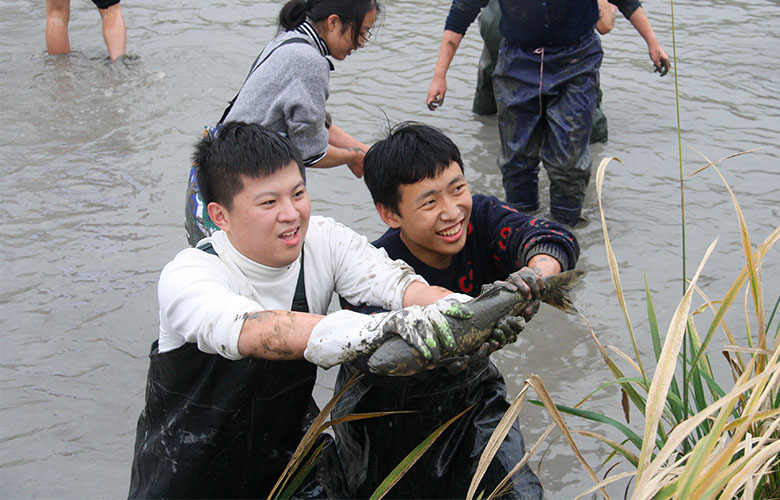 下午一点,同学们又开始了劳动。高二同学清理了茄子地、青椒地等,剑高高一的同学们则学习并种植了油菜,若是明年春天看到那一片油菜花,定会十分有成就感吧!随后,每个班分成抓鱼和挖番薯两组人马。抓鱼的同学大多穿上事先准备好的捕鱼裤,跳进鱼塘,竭尽所能抓住更多更大的鱼,即使脚一时陷入泥土,跌倒在泥水里也毫不气馁。而挖番薯的同学拿着小锄头开启“寻宝大赛”,看着自己从土里挖出的一大串番薯,获得了满满的成就感。晚饭同样丰盛,还有下午的劳动成果——番薯、鱼肉作为加餐,别有一番滋味。
