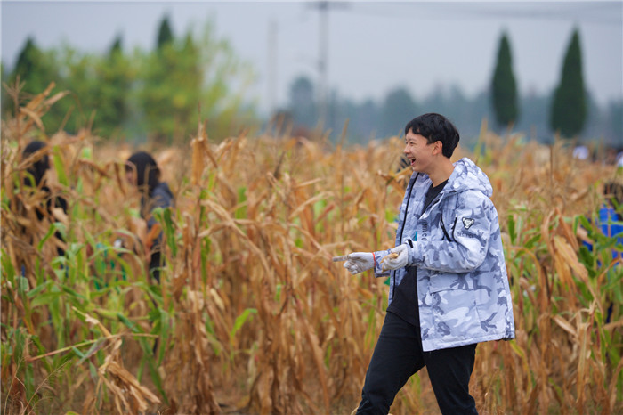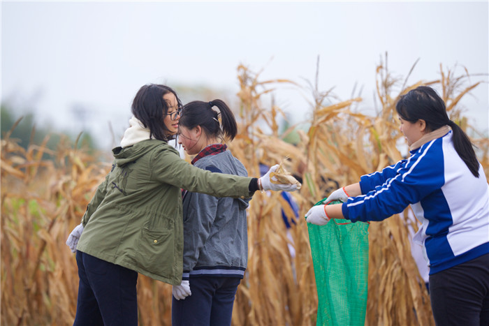 一下车,同学们争相笑了起来——只因闻到了那大自然的味道。上午,除了烹饪组的同学们,所有人都投入劳动任务:摘玉米。一开始,大家都干劲十足,一根根鲜嫩玉米棒子都打扮得像活泼可爱的胖娃娃似的,换上了黄色的棉袍,还争先恐后地探出那金黄的小脑袋来,仿佛在对着我们微笑。我们逐渐形成了流水线——一部分先锋兵把秸秆拔下来,把玉米从秸秆上取下,递给最后的把皮剥去,装进麻袋里,这个过程真可谓一气呵成。最后,两长排玉米被我们攻下,大家全都成了泥猴子!你看我,我看你,乐呵乐呵!