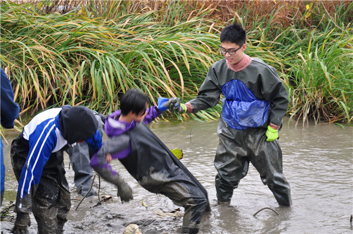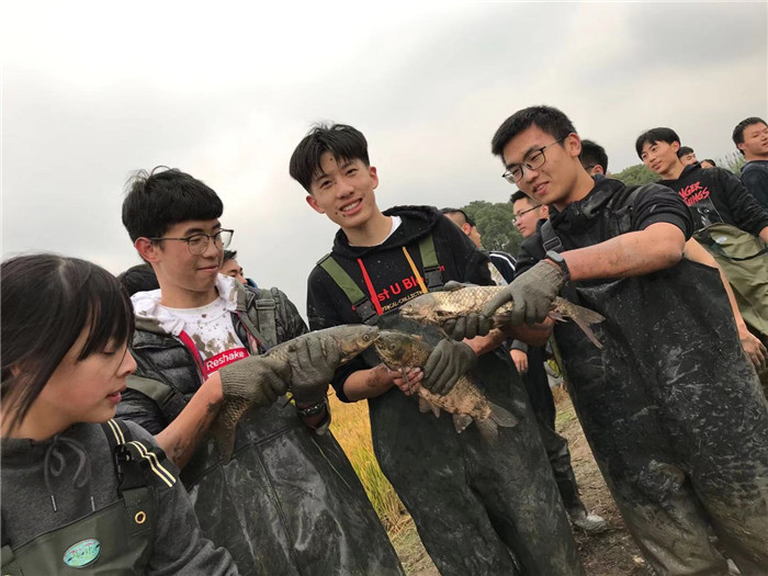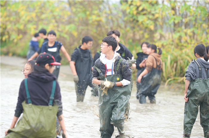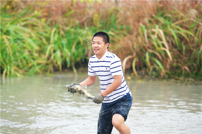 下午的活动更丰富了——种油菜、摸鱼、挖番薯……最令人印象深刻的当属抓鱼环节,几个身着专业捕鱼服的同学不惧严寒,冒着被陷入泥地中的风险,捉起了一条又一条的大鱼,那开心的笑容是属于劳动者的!