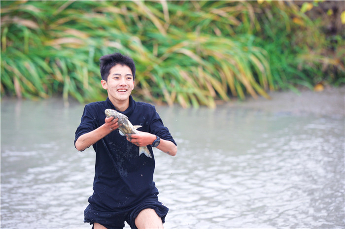 汤足饭饱,休息片刻之后,大家便继续“踏上征途”。除了手拿镰刀的“水稻英雄”外,更引人注目的应该还是穿上专业装备的“渔人”了。他们一个个全副武装:手套、衣服、胶鞋,一个不落下。下了水以后的同学们更是英姿飒爽,将团队协作运用到了极致。“鱼在这!”、“我们一起把那条鱼围住”、“大家一起来!”,叫喊声此起彼伏。每当抓到了一条鱼,无论是岸上,亦或是正抓鱼抓到一半的同学,都会鼓起掌来,由衷地表示祝贺。当大家满载而归,炊事班的同学们也准备好了丰盛的晚餐,端着热腾腾的饭菜,谈笑风生,好不满足!