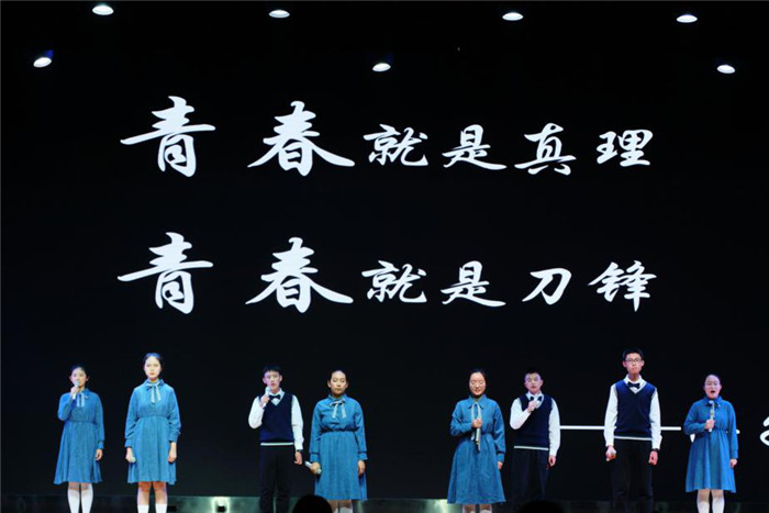 从不被理解的呐喊到吹响号角唤醒太阳,高一(2)班原创诗歌《青春的时间轴》以历史的轴线牵系在一起,回望历史,谱写未来,阐释了“狂澜力挽精英梦,还我河山壮此行”的真谛。同时,舞台的编排布局极富创意,磅礴的气势与丰富的情感使观众沉浸其中。
