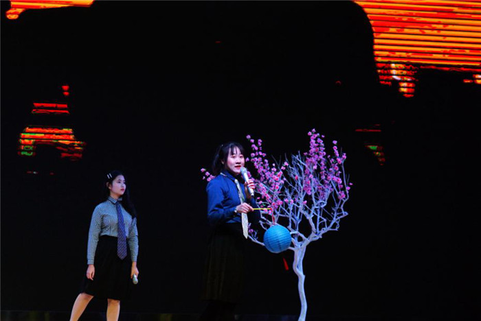晚会上,高一(2)班的胡笑恬和姚远同学承担了主持节目的任务,本届高一,年级活动采取了“承包制”,对同学们的能力培养,是一个不小的锻炼。介绍完到场评委——高中语文教研组组长楼佳钰老师、黄昊老师、郑燕明老师、校经典朗诵团团长陈君羊学姐后,首先出场的是高一(4)班的原创诗歌《当你再次和我讲起青春的故事》。巴黎圣母院,君士坦丁堡,杭州初雪,乌篷船,一对对朗诵者的出场,朦胧梦幻,层次感极强的舞台诉说着跨越时空的青春感悟。“我在你眼底能看到翻腾的太阳,也能看到满天的繁星。”雅致婉转的文字形象构画出我们脑海里的梦与幻想。