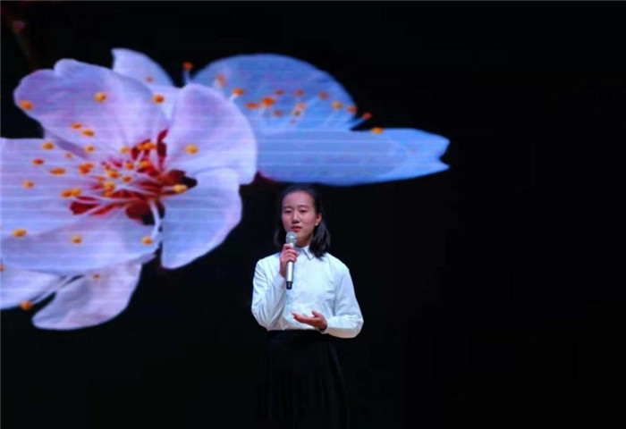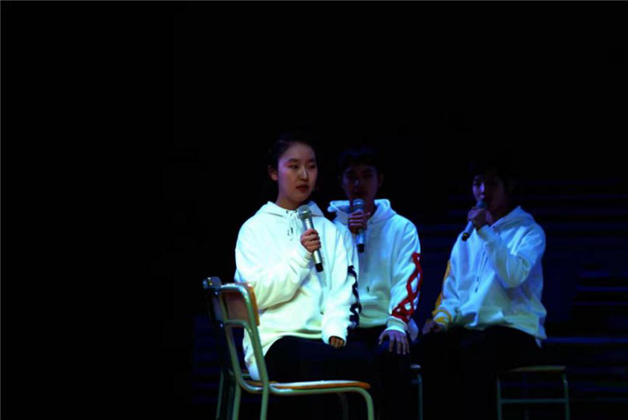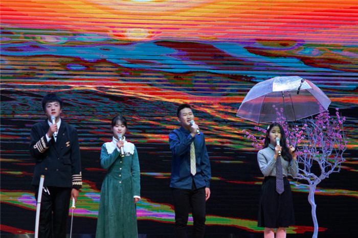 不同的,高一(3)班原创诗歌《三原色与纯白》则将青春定义在当下,“生活才是答案”,不同的颜色并不是束缚我们的标志,“我的青春是青春,而我是我”。在每一组朗诵结束后,一块块的彩布被铺展开来,亮丽的舞台布置使观众对诗歌的理解更加深刻。