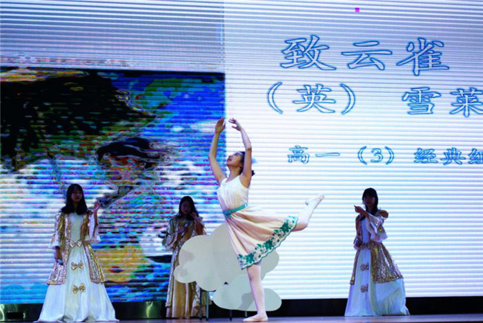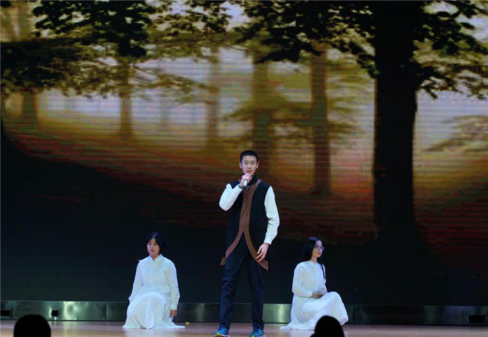西方浪漫的哲学幻想在诗会中也必不可少。高一(3)班和高一(2)班的经典组分别选择《致云雀》和《夜莺颂》作为朗诵篇目。在优美的舞蹈中,《致云雀》组以华丽的欧式服装出场。他们用抑扬的声调展现作者对云雀——光明与欢乐的象征的追求,演绎出原诗宏阔与精致并存的美。《夜莺颂》组则以朦胧的白衣,或蹲或伏的姿势,展现诗人的忧郁与迷惘。朗诵成员感情处理细腻,演绎流畅而投入。全诗的情感跌宕而沉郁,最终化为一句梦寐“我是睡,是醒?”