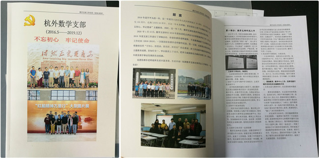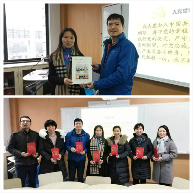 首先,支部举行了给12月入党的7名党员教师过政治生日的庆祝活动,支部为七位同志致以“政治生日”的祝福,重温了入党誓词,组织委员徐国君同志为老师们发放了祝福贺卡。支部书记张传鹏同志还为支部即将退休的徐惠珍老师赠送了纪念册——一本数学支部工作纪实。这本工作纪实总结了自2016.5数学支部成立以来,支部在党建引领、支部建设等方面的工作。整理、编排这本支部工作纪实,一方面是赠予徐惠珍老师留作纪念,对徐老师一直以来为支部所做出的贡献表示感谢。另一方面,也希望支部全体同志将继续按照“守初心、担使命,找差距、抓落实”的要求,在工作实践中继续巩固和深化主题教育成果,在知行合一、学以致用上下功夫,做到不忘初心再回首、牢记使命又出发。