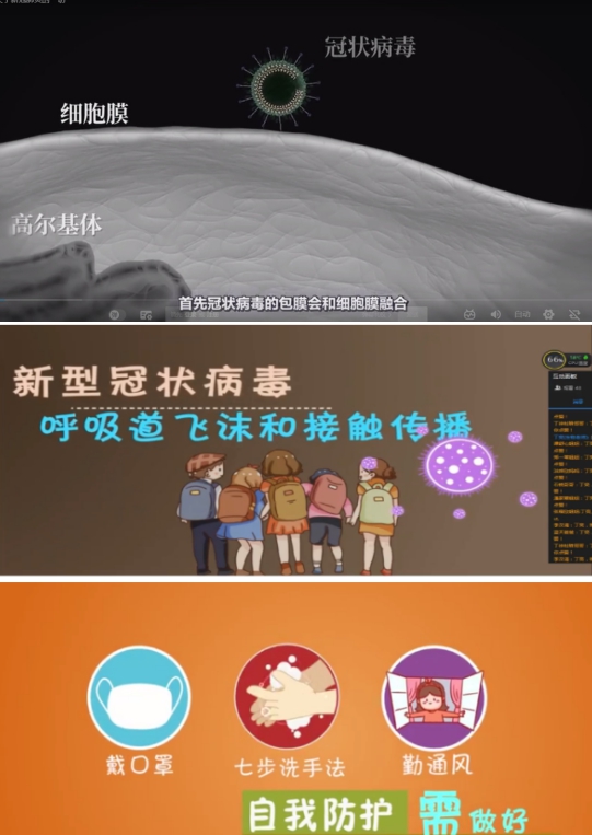 高二1班丁亮老师充分发挥生物老师的专业优势,将新冠病毒如何入侵人体、感染、发病的过程以视频形式形象展示出来。高二2班方永平老师作为新晋“网红主播”,霸气露脸,硬核讲解防疫知识,实力圈粉。