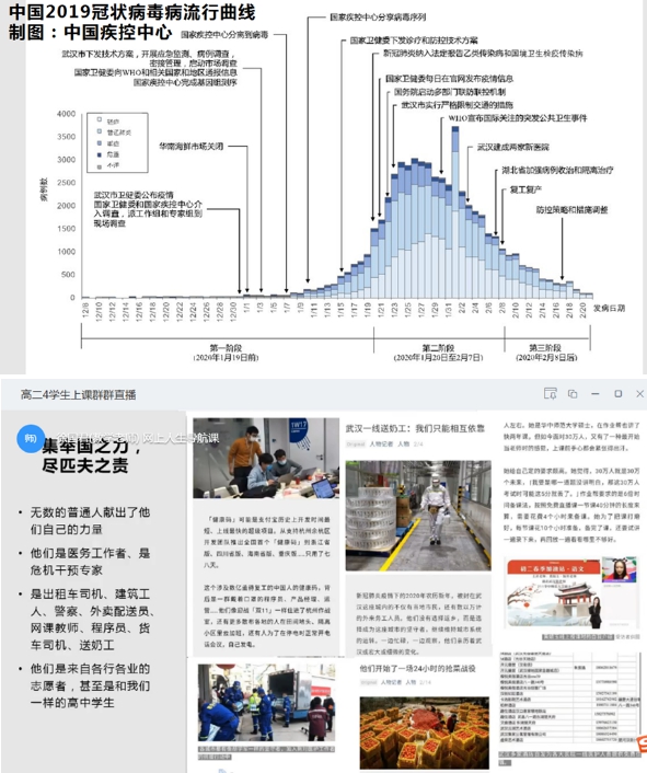 高二3班孙艾菁老师介绍了网络上课的“SMART目标法”——S:specific(明确的目标),M:measurable(可衡量性),A:attainable(可达成性),R:relevant(相关性),T:time-based(时限性)。高二4班徐国君老师则通过分析随日期推进病例数的变化,看到大疫面前,集举国之力的制度优势和每一个普通人“尽匹夫之责”的感人力量。