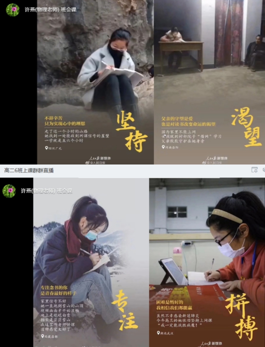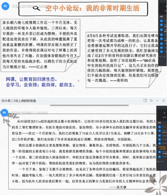 高二5班苏云生老师分享了江止善、蒋昕昀、郭千尘、宁远等同学寒假及居家学习的思考、感受和行动,还介绍了吴天睿同学参与的杭外校友会募捐志愿行动的经历。苏老师要求同学们在“逆行者”身上学会责任与担当,在信息的狂云浊浪中,守护自己心底冷静和理性的灯塔。高二6班许燕老师通过视频和同学们一起学习了防控疫情的科普知识;例举了在艰苦条件下克服困难上网课的同龄人,激励同学们抓紧时间,努力学习。