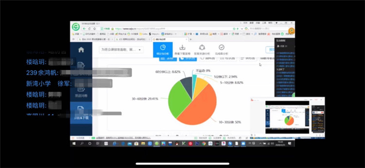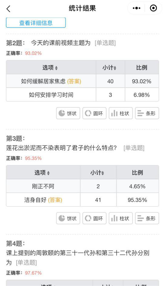 本次班会共分为三个部分:第一部分 “我与疫情”,内容涉及自然教育、榜样教育和生命教育,生活委员准备若干选择或者判断题目通过屏幕共享来展示,同学们在对话框中抢答或者口头回答;第二部分“吹捧与互黑时刻”,宣传部采用课前在线共同编辑一份文档的形式,提前设计了居家生活分享单,让同学把在家中生活最有趣或最特别的一两件事分享出来,还请同学投出最喜欢的一节网课和最喜欢的网课细节,以及网课期间为班级做出贡献的班级雷锋。在线表格填写虽然不匿名,但内容依然丰富,有很大相互借鉴意义和正能量,经过演讲同学的总结归纳,更是让小“神兽”们点亮了心中的明灯;第三部分 “班级的春天”,文艺部的同学们选择了在线朗诵接力的形式,选取同学在文学课堂上创作的诗词,歌颂疫情期间美好瞬间,按照学号对诗词编号,一人一句朗读一首诗,甚至用不同的语言为武汉加油打气,班级在线朗读者形式独特,极具意义。
