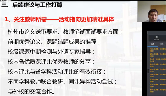 最后,张传鹏老师作总结发言。他强调做科研要重在过程,要用心做好教育教学、在教学中总结反思,带着科研意识做好工作,从而提高自身素养 ,“但行好事,莫问前程”。