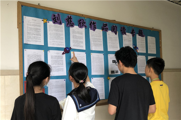有些同学早就读过很多刘慈欣的作品,称得上是“科幻迷”,听闻这个作业,更是欢欣雀跃,很快就列出阅读计划,和同学一起讨论书中的情节和人物,有些甚至回寝室后仍在津津乐道;有些同学对刘慈欣还相当陌生,也很快去学校图书馆借阅他的作品。一时间,随处可见同学们手中捧着《三体》《球状闪电》《全频带阻塞干扰》《乡村教师》等作品,整个年级充溢着浓浓的科幻气息。