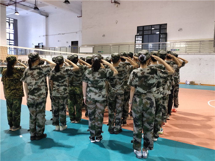 太阳的暴晒转变为了室内的闷热。站姿,敬礼,转向,踏步,这些老生常谈的基本军训项目,自然是不可逃避。午后的阳光很火热,闭塞的室内很闷,长时间的训练又困又累。尽管有很多同学身体不适,但更多的同学都选择继续坚持。