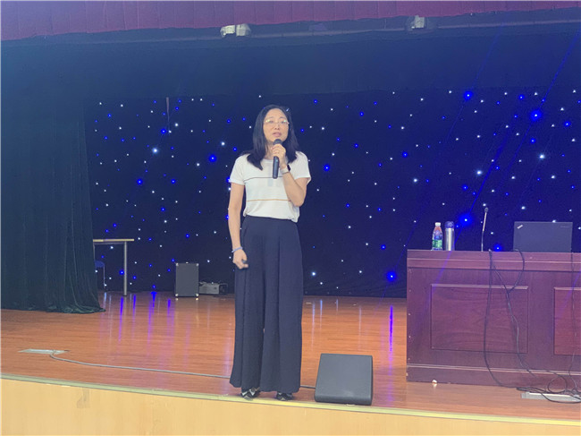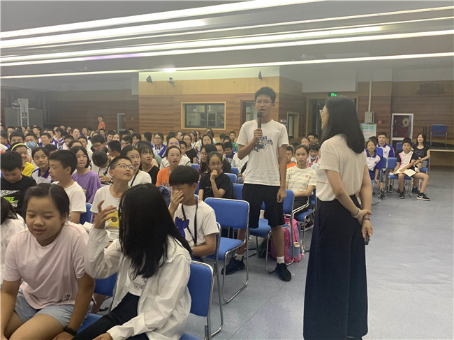 同学们在明亮而宽敞的报告厅里兴奋地等待着讲座的开始,灯光照耀着同学们的脸庞。伴随着音乐,初中英语教研组长王凝迟老师走上了舞台,亲切地问候同学们。讲座从礼仪和礼貌开始,王老师告诉我们,做人要有最基本的礼节,在与人交谈时,用thank you作为句号。她先问了大家“HFLS”到底是什么意思,同学们的热情很高,都激动而又略带骄傲地给出了答案。王老师轻轻一笑,又问了一个问题:“你们对杭外的印象是什么?”原本安静的会场一下子喧闹起来,大家都拼命地举手想抒发自己的意见,大家的问答也十分精彩,王老师给予了他们鼓励和认同。