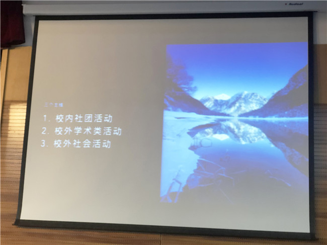 活动可分为校内的社团活动、校外学术类活动以及校外其他社会活动。在这里我们拥有着数量庞大的社团资源,学姐建议在高一上学期可以尽情地按照喜好报名,之后便要根据自己想选择的专业及方向留下三到四个做持久、做精。校外学术类也需要根据自己的专业方向选择要参加的比赛、研究等。其他活动包括做公益、社会实践等。