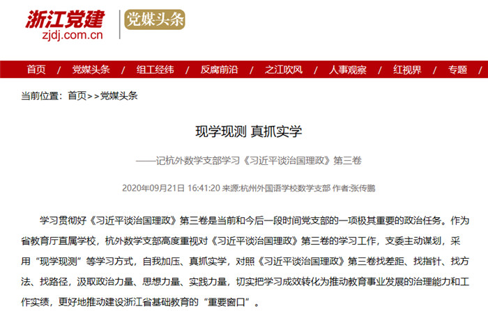 9月21日,浙江党建网党媒头条栏目刊登了我校数学支部开展学习《习近平谈治国理政》第三卷活动的报道。
