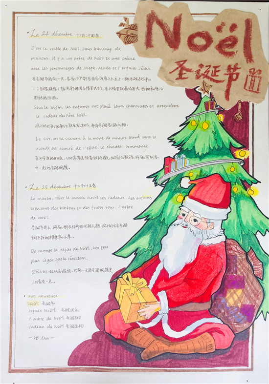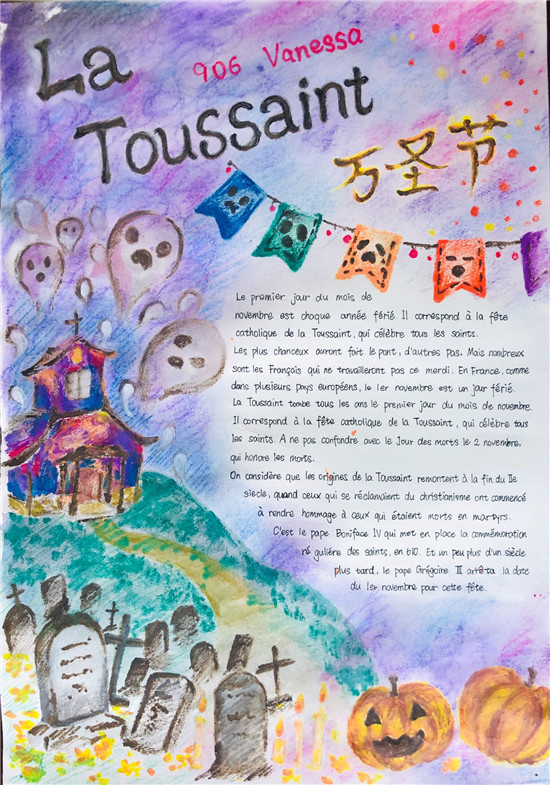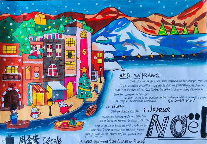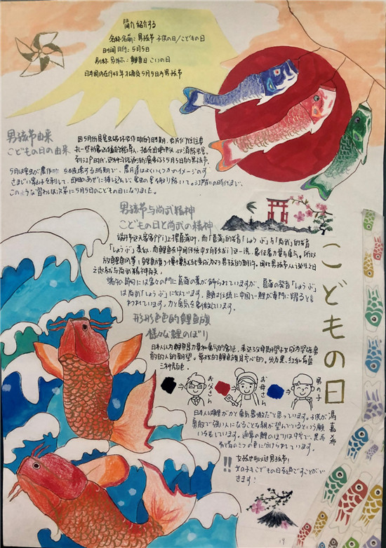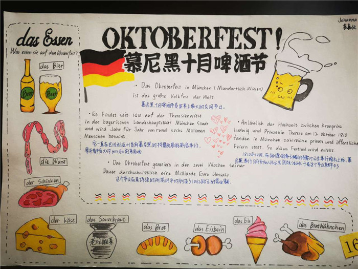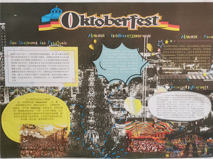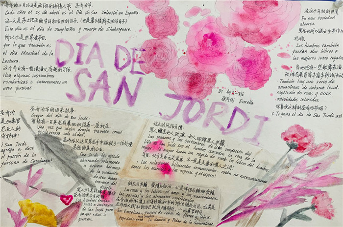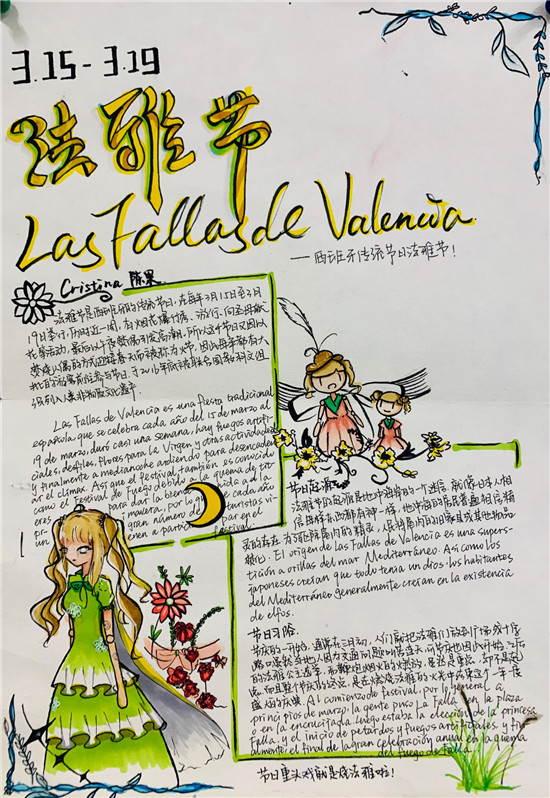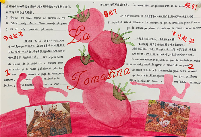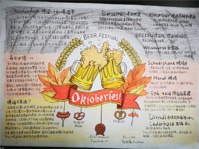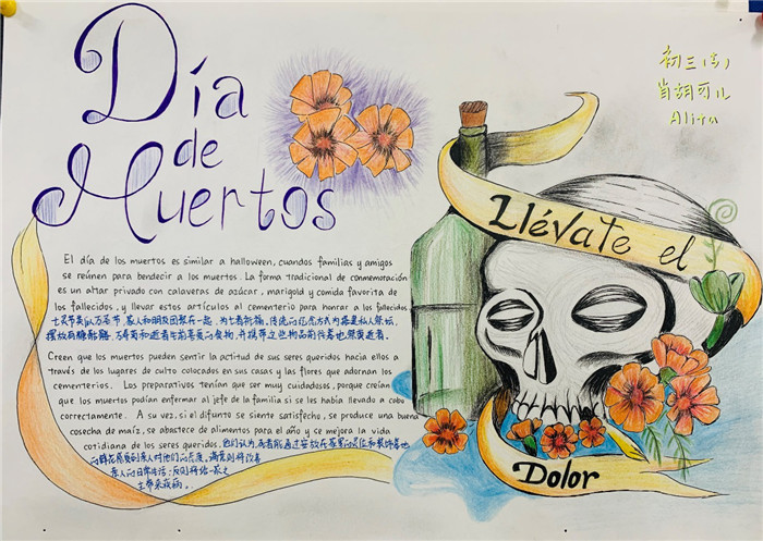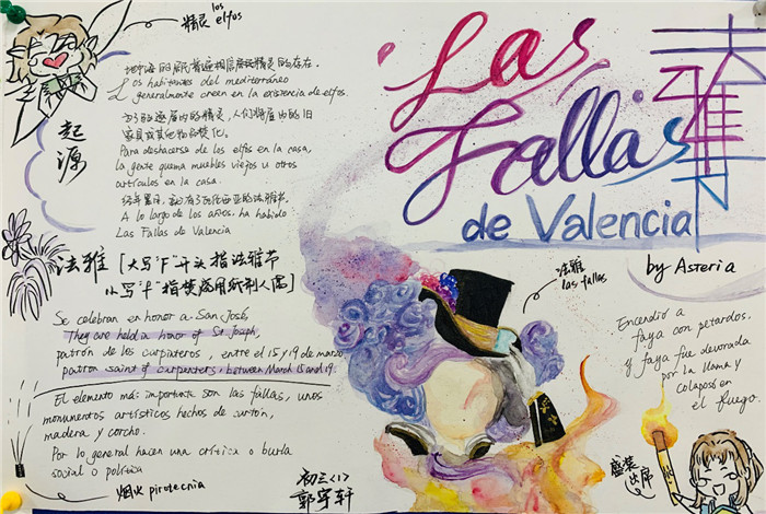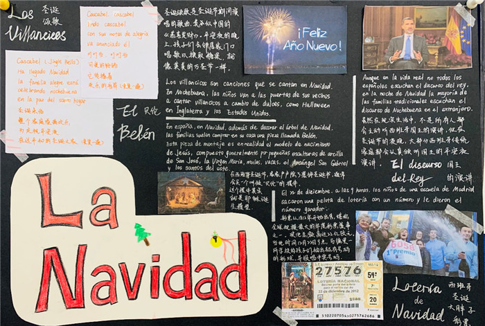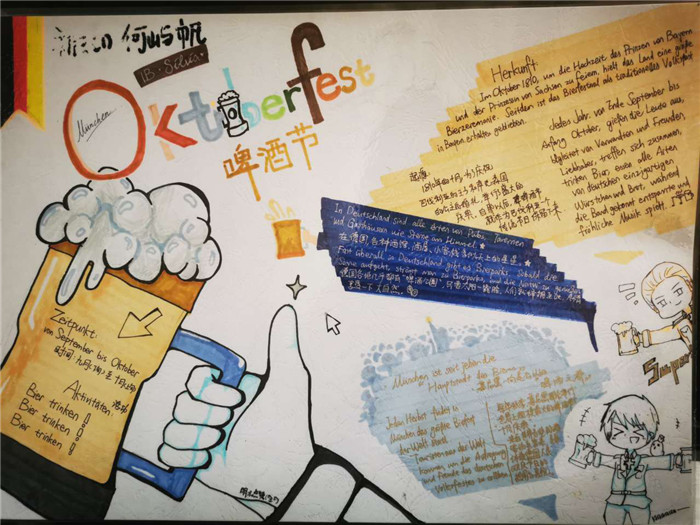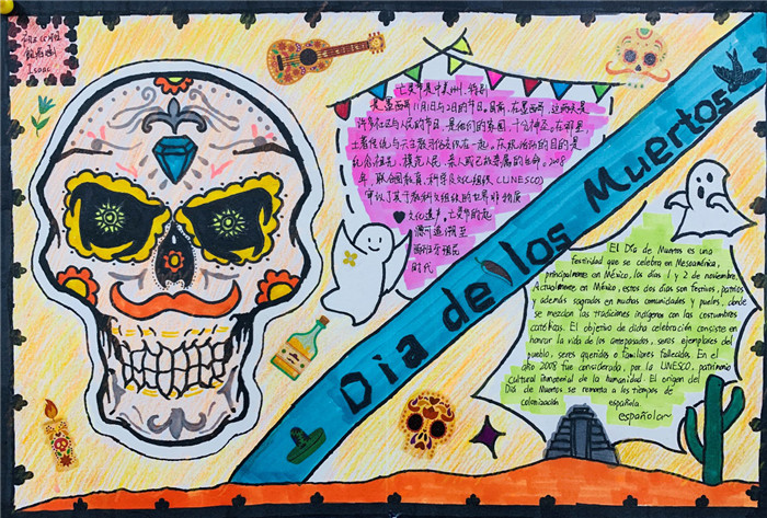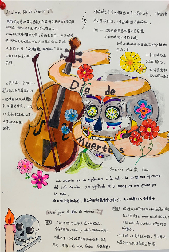 除此之外,初三年级还进行了四种语言直属国传统节日的海报大赛。走进二外教室,你一定会被靓丽的墙面吸引——这儿张贴着同学们精心制作的海报。同学们利用暑期查资料,对法、德、西、日四个国家的节日了解后以绘画结合文字的形式呈现出精彩纷呈的画作,在制作过程中对所学语言及其文化有了更深层次的探索。