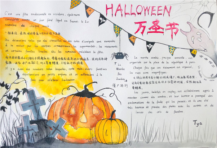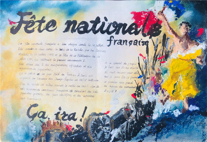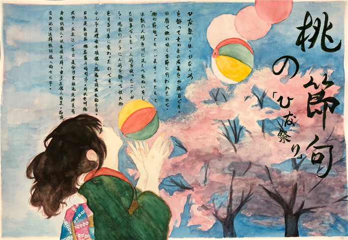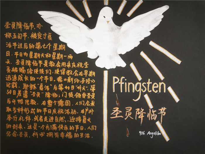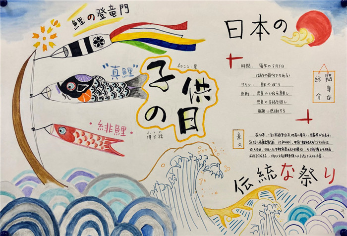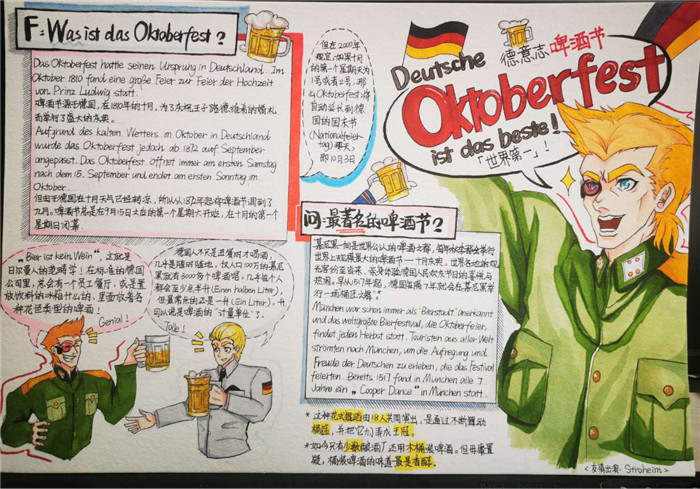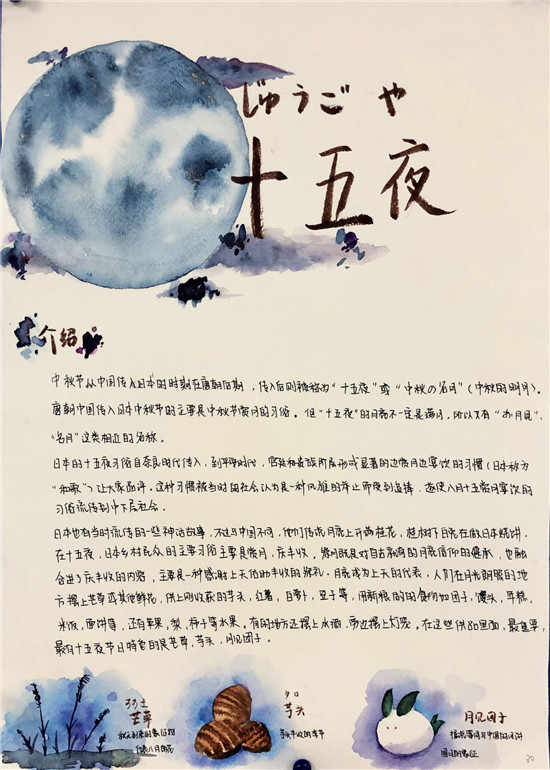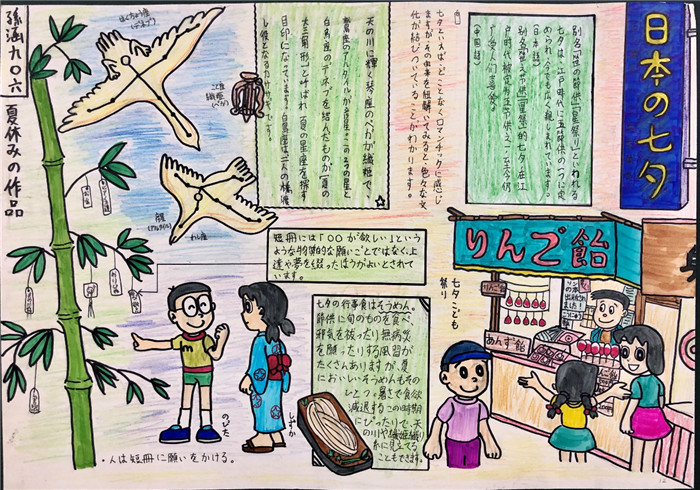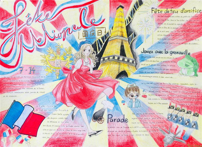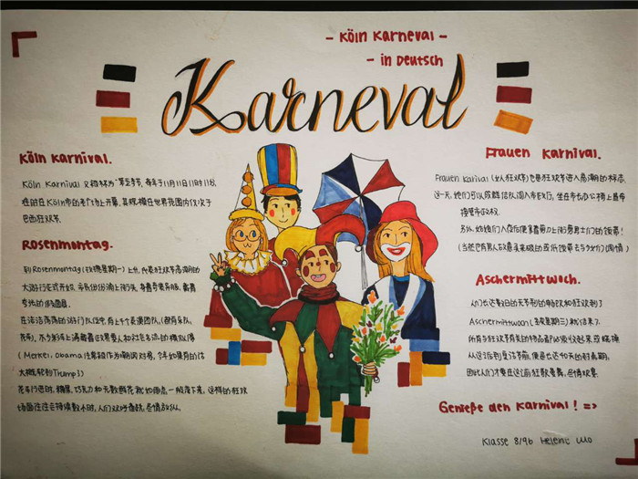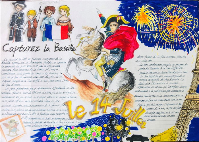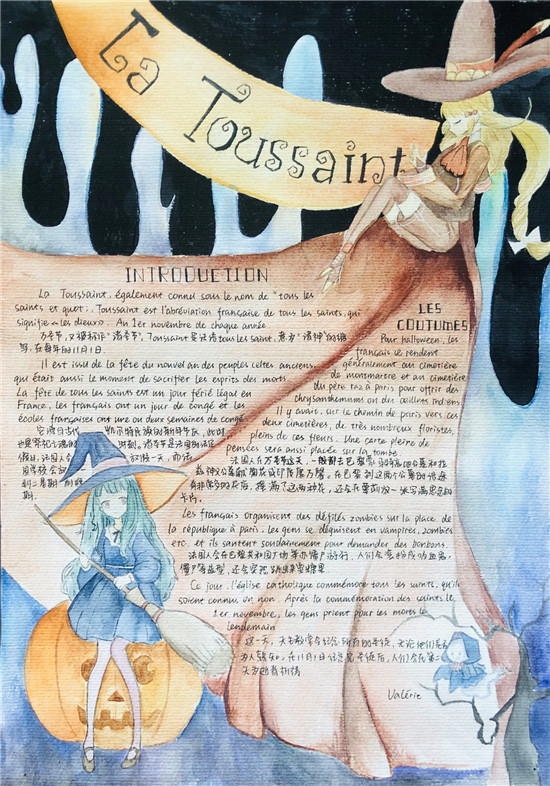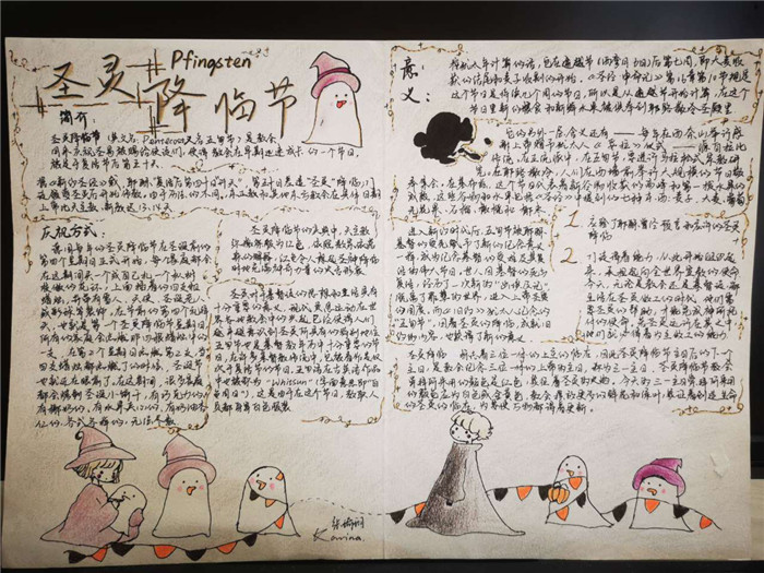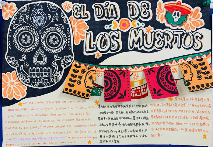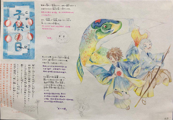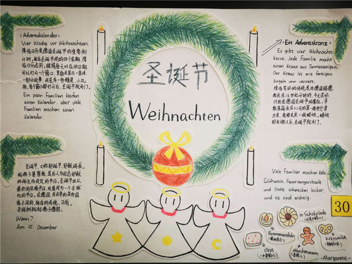 除此之外,初三年级还进行了四种语言直属国传统节日的海报大赛。走进二外教室,你一定会被靓丽的墙面吸引——这儿张贴着同学们精心制作的海报。同学们利用暑期查资料,对法、德、西、日四个国家的节日了解后以绘画结合文字的形式呈现出精彩纷呈的画作,在制作过程中对所学语言及其文化有了更深层次的探索。