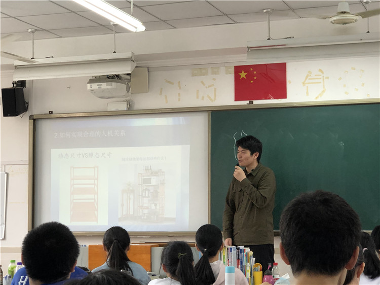 汇报课的第一部分为实现人机关系的目标。李文轩老师以学生组织打篮球为情景导入,通过分析篮球场地器材,篮球鞋等与人的关系,带领学生切身体会人机关系需要实现舒适、健康、高效、安全的目标。第二部分,李文轩老师通过视频,图片的举例,带领学生分析如何实现合理的的人机关系。课堂上学生积极互动,课堂气氛活跃。