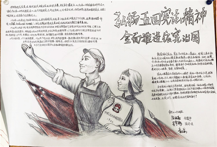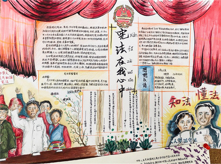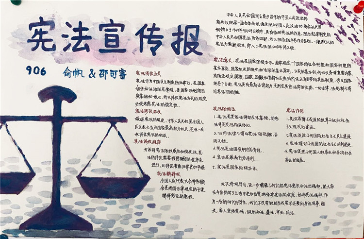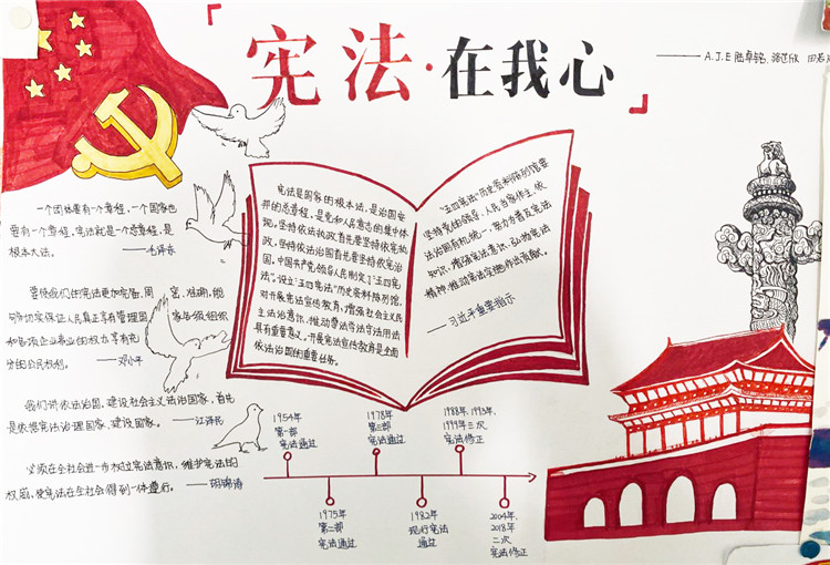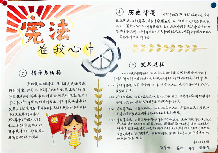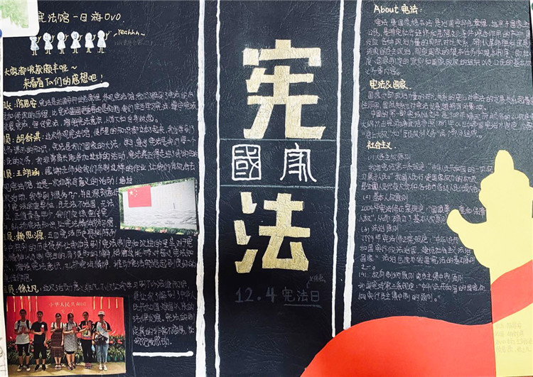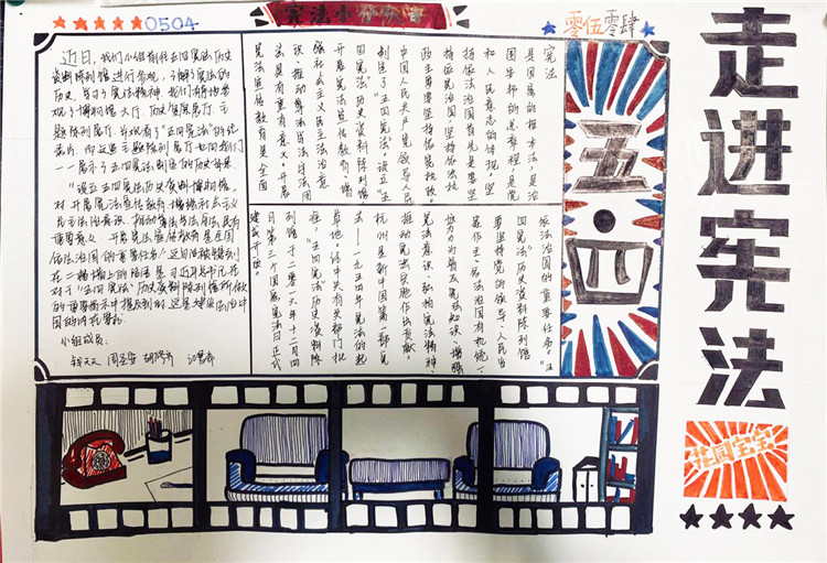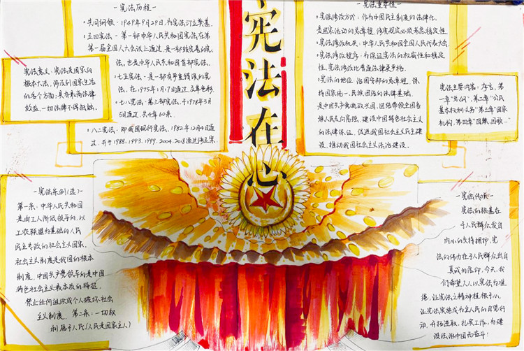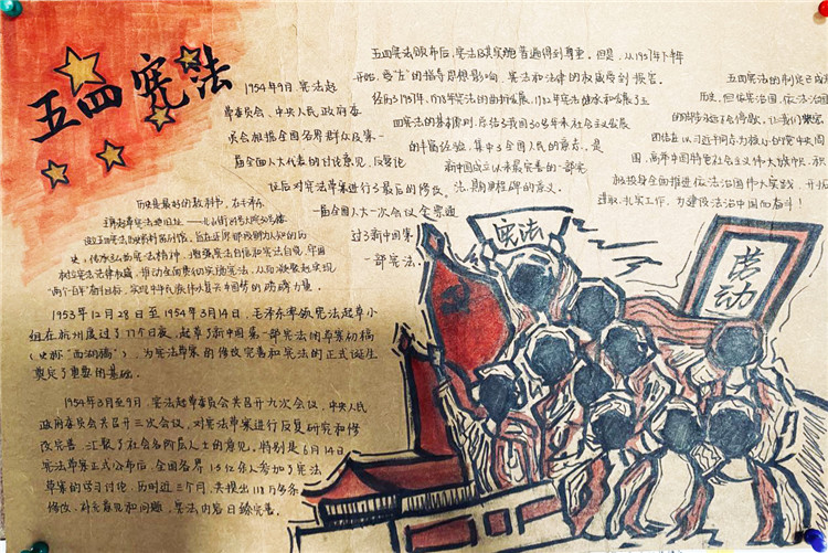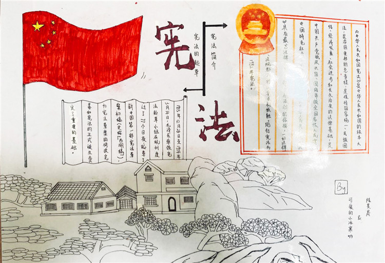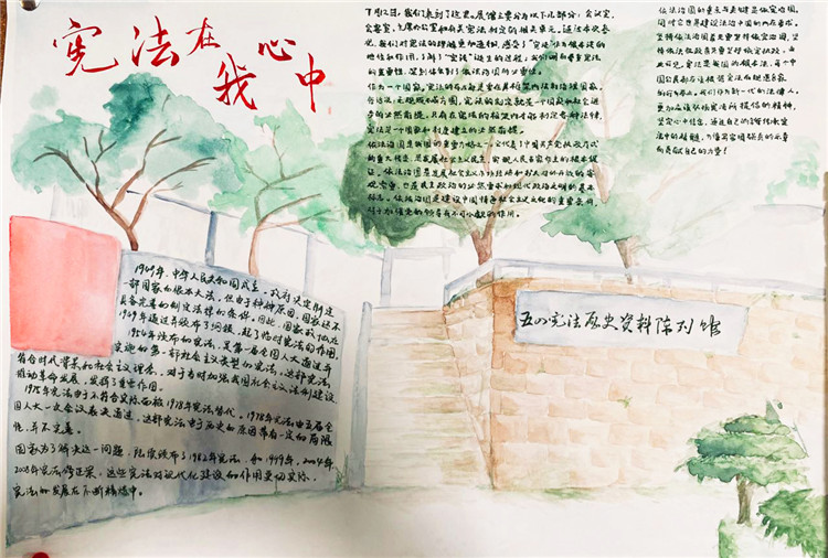 2020年7月4日,我们小组五个人一早就去到了纪念馆进行参观。一进门就被一阵浓浓的历史气息所包围。宪法的提出到完善,那些我们既陌生又熟悉的历史一一展现在我们面前。木制楼梯嘎吱嘎吱的响声,令我一下子走入那段过往的时光。走入另一座纪念馆的大门,墙上密密麻麻的各种法律令我为之一振。原来在我们看不见的地方已经形成这样一套完备又细致的法律体系。参观完纪念馆,我们就开始了海报的制作,往上写字时我小心翼翼,生怕因为我的一个失误失去了它本该有的光彩,幸好我做好了。