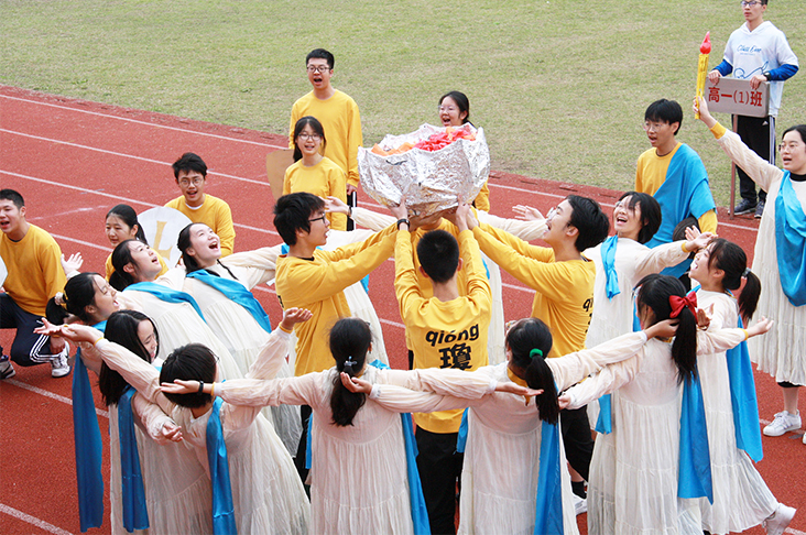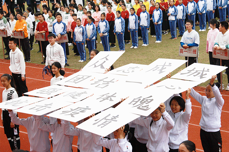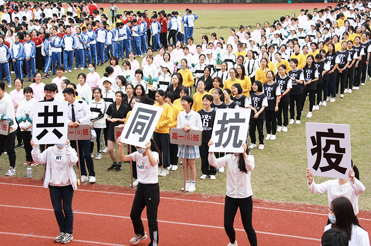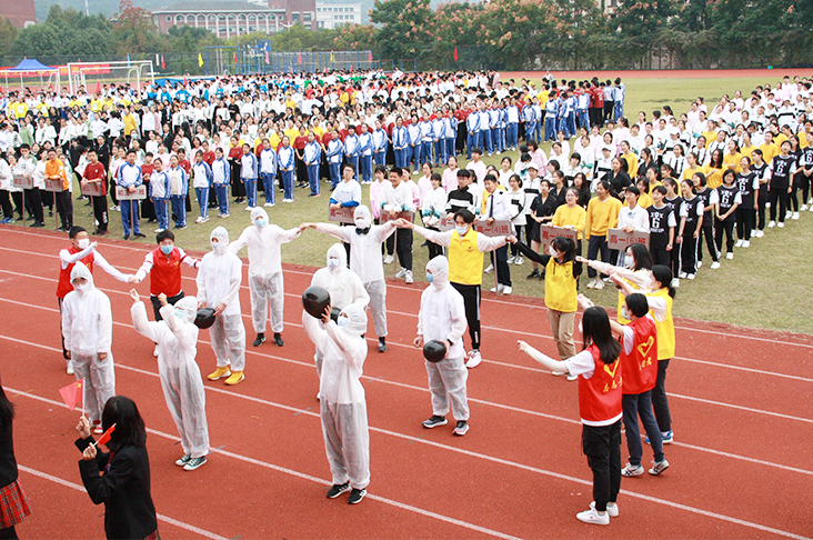 在开幕式上,各班方阵一一走过主席台前。他们或整齐划一、激情豪迈,或青春飞扬、活力四射,无论是服装、道具还是展示主题,可谓是创意十足、精彩不断,充分彰显了我校学子阳光、自信、大气、睿智的风采。值得一提的是,在展示环节,许多班级都选择了“抗疫”主题,他们通过口号、标语和造型等方式,表达了对生命的敬畏、对健康的珍视和对抗疫英雄们的崇敬之情,令人印象深刻。