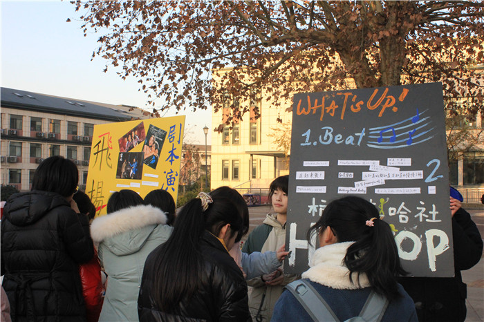 各社团负责人使尽浑身解数为本社进行宣传:公益社通过慈善捐物的方式提高同学们的公益热情,传播社会正能量;韩社、历史社、商社、动漫社等通过随机问答、知识竞赛、趣味科普等方式进行社团普及推广活动;魔方社、航模社等具备实操条件的社团则通过兴趣体验等实践形式帮助同学们零距离接触与感受操作规程。