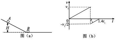 (2019全国Ⅰ卷第25题)竖直面内一倾斜轨道与一足够长的水平轨道通过一小段光滑圆弧平滑连接,小物块B静止于水平轨道的最左端,如图(a)所示。t=0时刻,小物块A在倾斜轨道上从静止开始下滑,一段时间后与B发生弹性碰撞(碰撞时间极短);当A返回到倾斜轨道上的P点(图中未标出)时,速度减为0,此时对其施加一外力,使其在倾斜轨道上保持静止。物块A运动的v-t图像如图(b)所示,图中的v1和t1均为未知量。已知A的质量为m,初始时A与B的高度差为H,重力加速度大小为g,不计空气阻力。