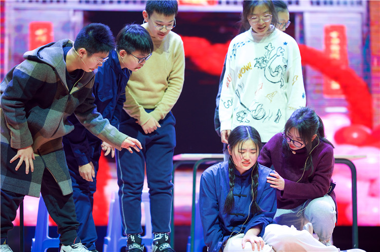主持人话音一落,大幕徐徐拉开。Y1C班同学带来的《婚宴》讲述的是杨有福和吕德才两家人因为一个诅咒而引发的矛盾,最后闹上法庭的故事。故事反映了乡土中国中道德社会和法治社会的冲突,杨有福一家因为不具备法律知识而从原本占理的一方变为了失败的一方。其中展现了乡土百姓无知和弱势的一面,在让人同情的同时引人深思。