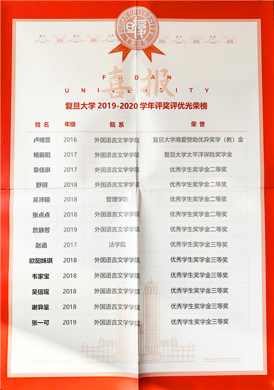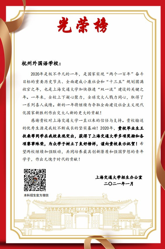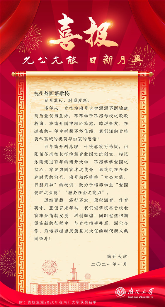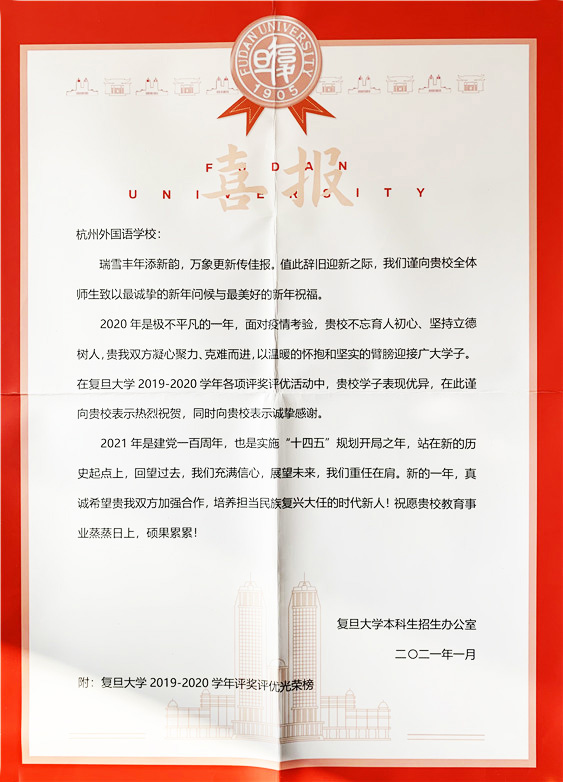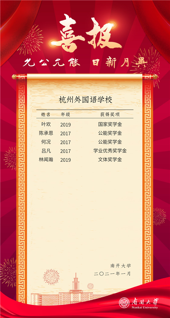 近日,复旦大学、上海交通大学、南开大学等高校相继发来喜报,我校多名在上述高校就读的毕业生荣获各项荣誉和嘉奖,充分展示了杭外学子的学习品质、创新能力和综合素养。