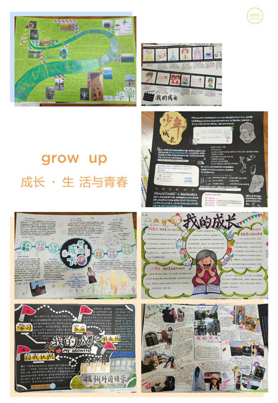 有的同学用电影记录的方式,绘制了自己的成长过程。清晰的结构布局、严谨的主题内容、还有设计感极强的板块层次,加上丰富的色彩与内容协调一致,让人眼前一亮。有的同学用漫画的形式,辅之以对成长的理解与感悟,让我们直观地感受到了主题思想,一目了然。不管是何种形式,大家制作的小报呈现出了大家各自的成长经历,对于成长的理解,对于青春的感悟,见人见智,它们告诉我们每个人成长是多么让人兴奋的事情啊。也许,成长就是这样不拘一格,青春就是这样多彩多姿。