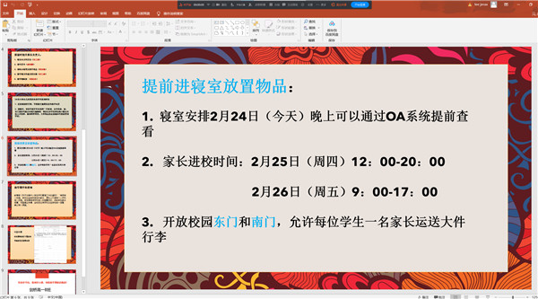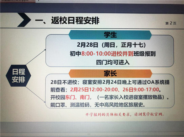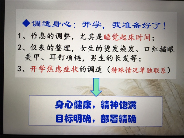 有关开学报到的安排,老师也再三强调了时间、所需物品等注意事项。因为报到当日也是周边的高校学生返校日,学校贴心地建议我们做好交通预案并且合理规划出行时间。对于大家都很关心的新学期新的管理制度问题,老师也进行了专题解释说明。
