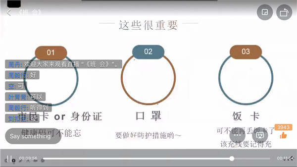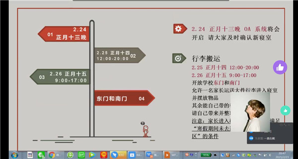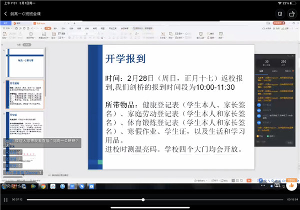 2月23日晚上8点半,线上班会准时开始。主持人为防止同学们的记忆误差,强调了报到时间和必带物品。同时,由于周边各校报到时间相近,为避免车辆拥堵,建议了报到的最佳返校路线,为有序返校报到奠定了良好基础。